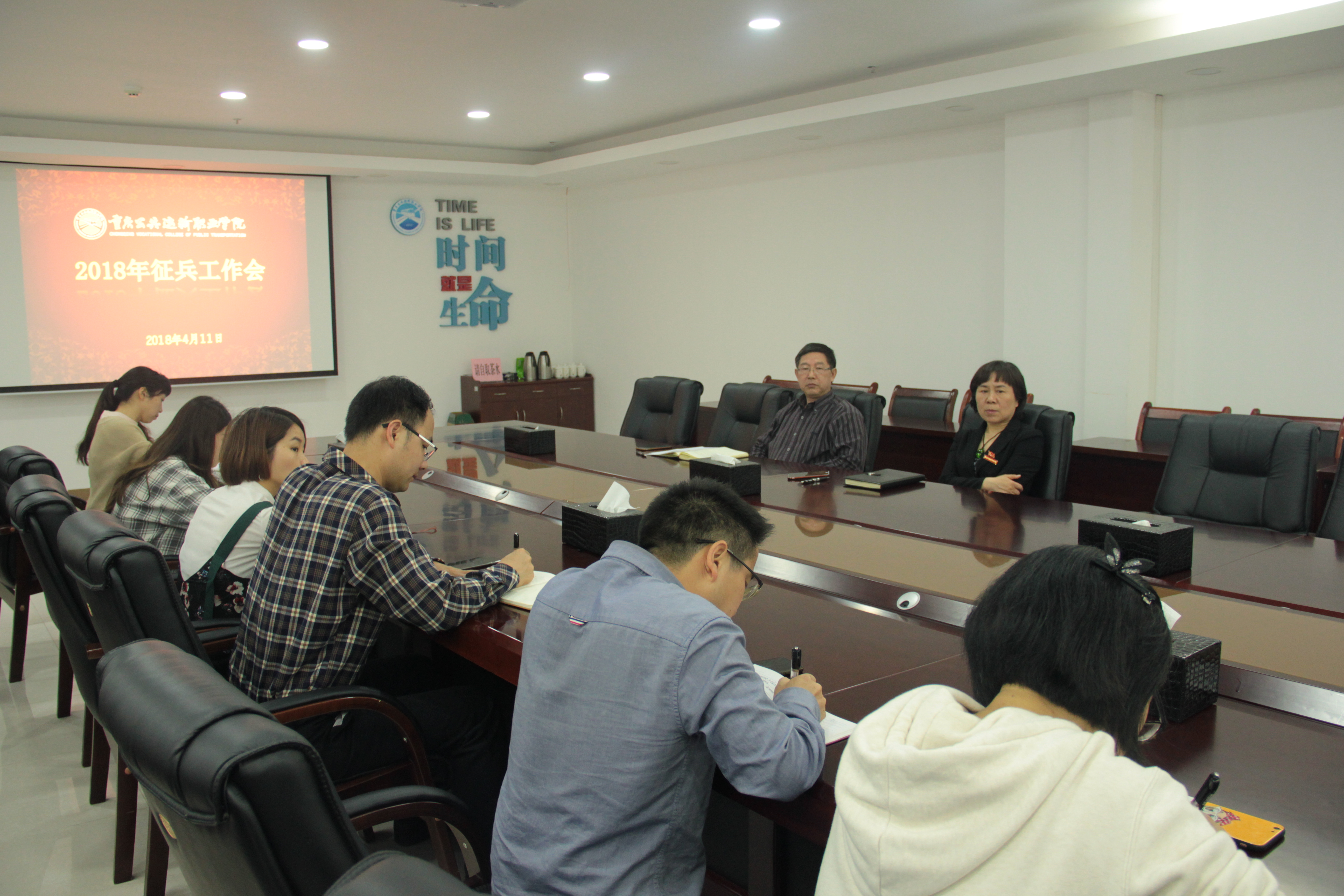 2018年4月11日上午9:30,学院召开2018年征兵工作专题会,参加会议的有:党委书记彭超、分管安全稳定领导邱发胜、各系书记及学工办主任。