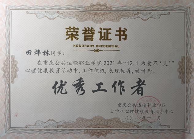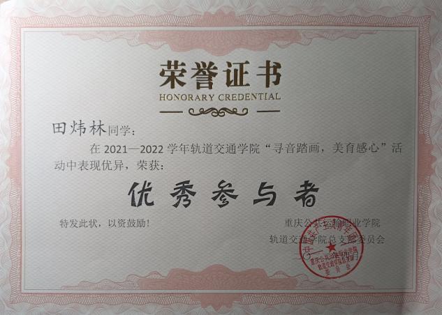 他踏实肯干,不仅在校参加各种活动,还积极响应学校号召参与社会实践。不仅参与了重庆华侨城的社会实践,还参与了重庆客运段春运社会实践。在实践中任劳任怨,努力做到了客户至上,用心服务。当重庆疫情再次爆发的时候,他毅然加入志愿者服务,并担任了组长,带领组员们为同学和老师们服务,为疫情防控奉献出了自己的一份力量。