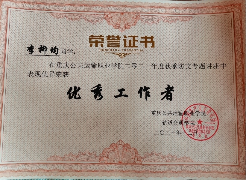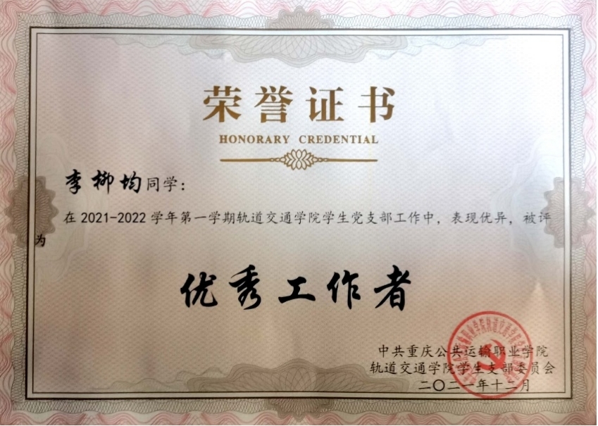 他在高等学校英语应用能力考试中同时取得AB级两项证书,在“弘扬敬老美德,传承红色基因”敬老院活动获得“优秀工作者”称号。他参加了为期14天志愿服务时长超过120小时的重庆北站“暖冬行动”,服务人次超过700人次。他思想积极进取,拥护中国共产党的领导,爱党爱国爱校,递交入党申请书,积极向党组织靠拢,时刻严格要求自己。青春正当时,不负好时代,他砥砺奋进,不负时代机遇,不负青春时光。