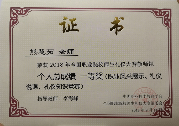 近日,在刚结束的2018全国职业院校师生礼仪大赛(教师组)的比赛中,我系运输教研室专任教师熊慧茹荣获“”一等奖“”。