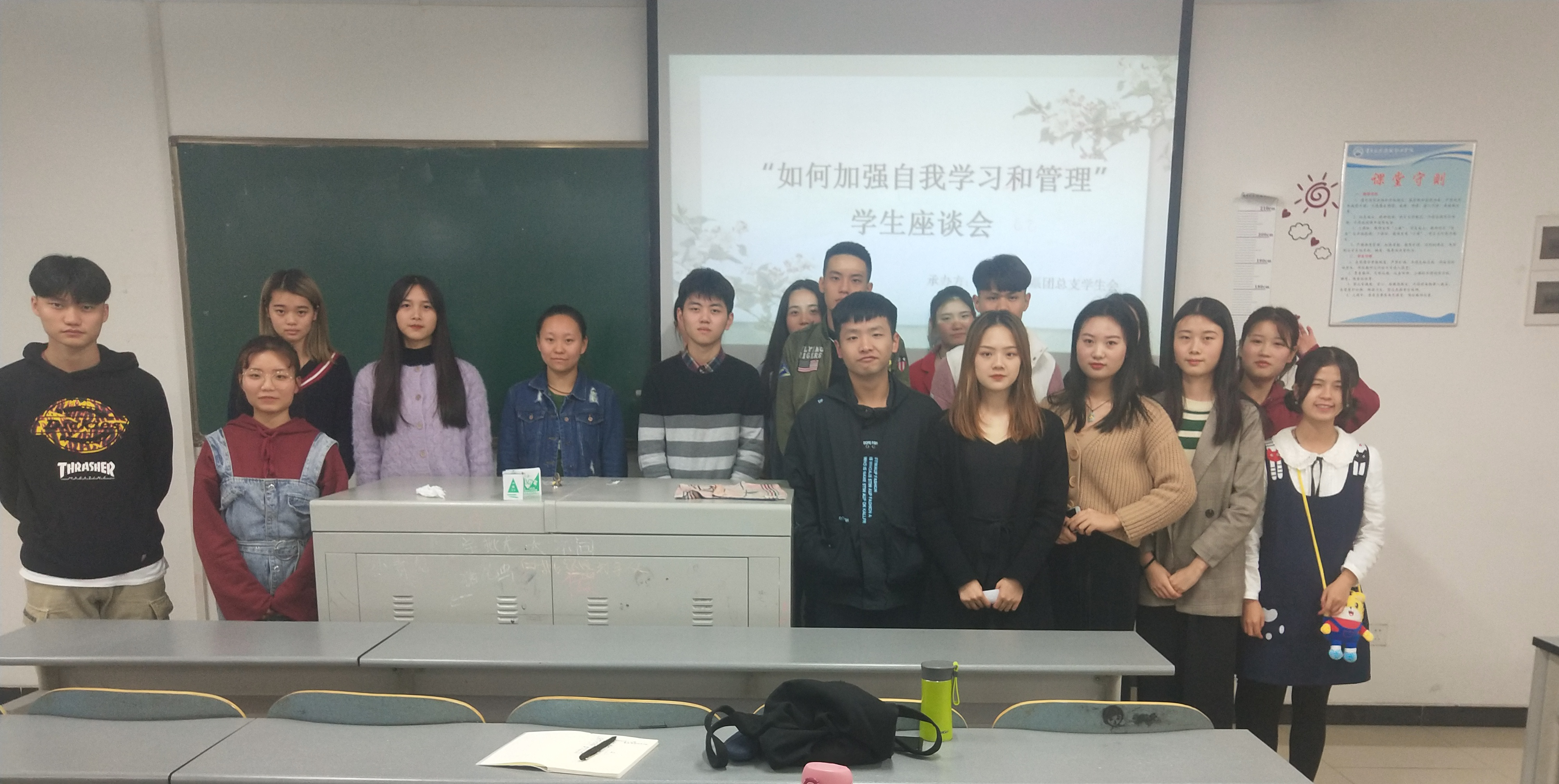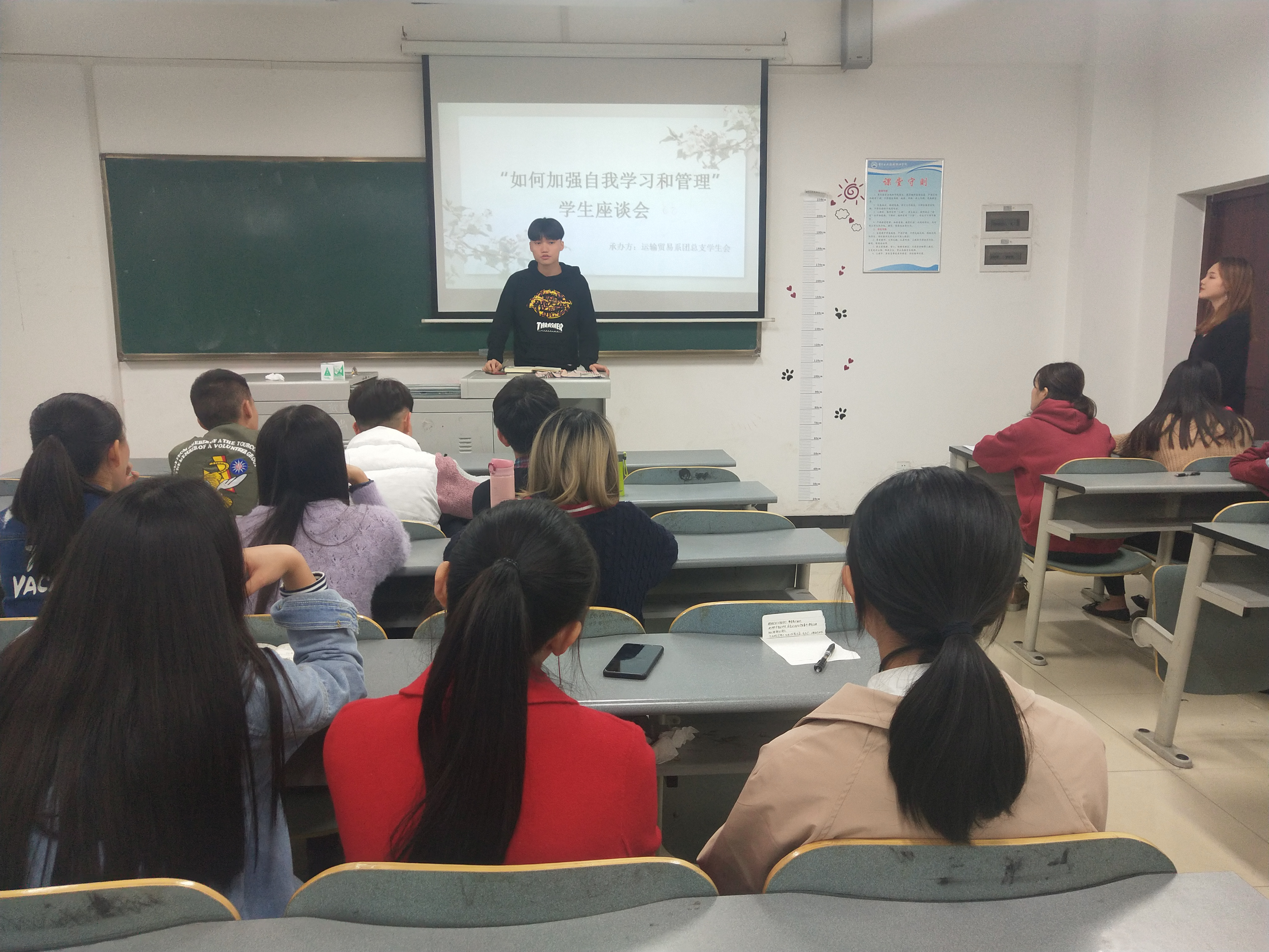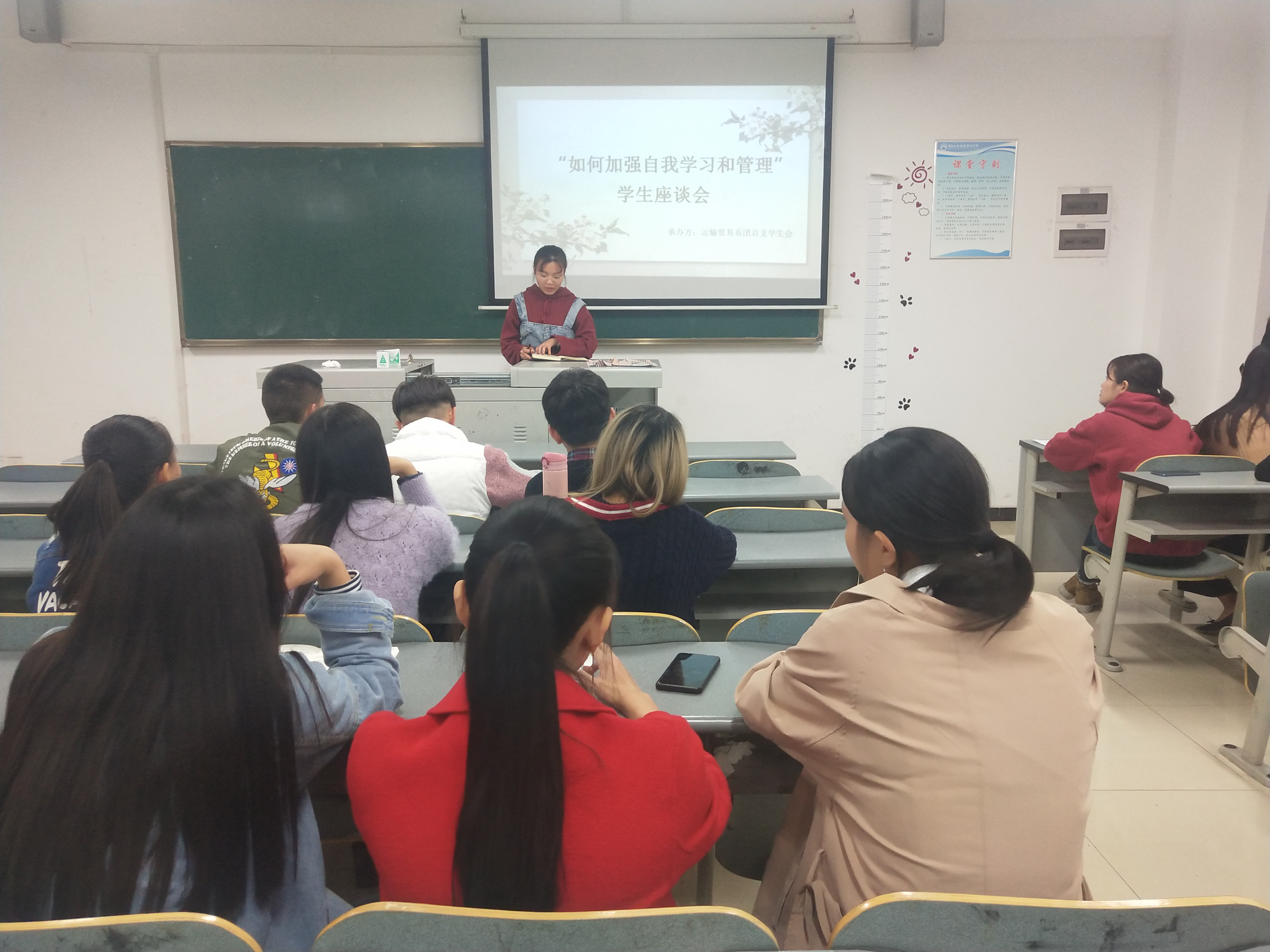 为了提高同学们的自我学习能力,增强自我管理意识。运输贸易系团总支学生会于2018年10月23日19:00在教学楼B205开展了以“如何加强自我学习和自我管理”为主题的座谈会。我系团总支学生会主席陈颖、副主席贺本豪以及各部门部长和代表干事们参加了此次会议。
