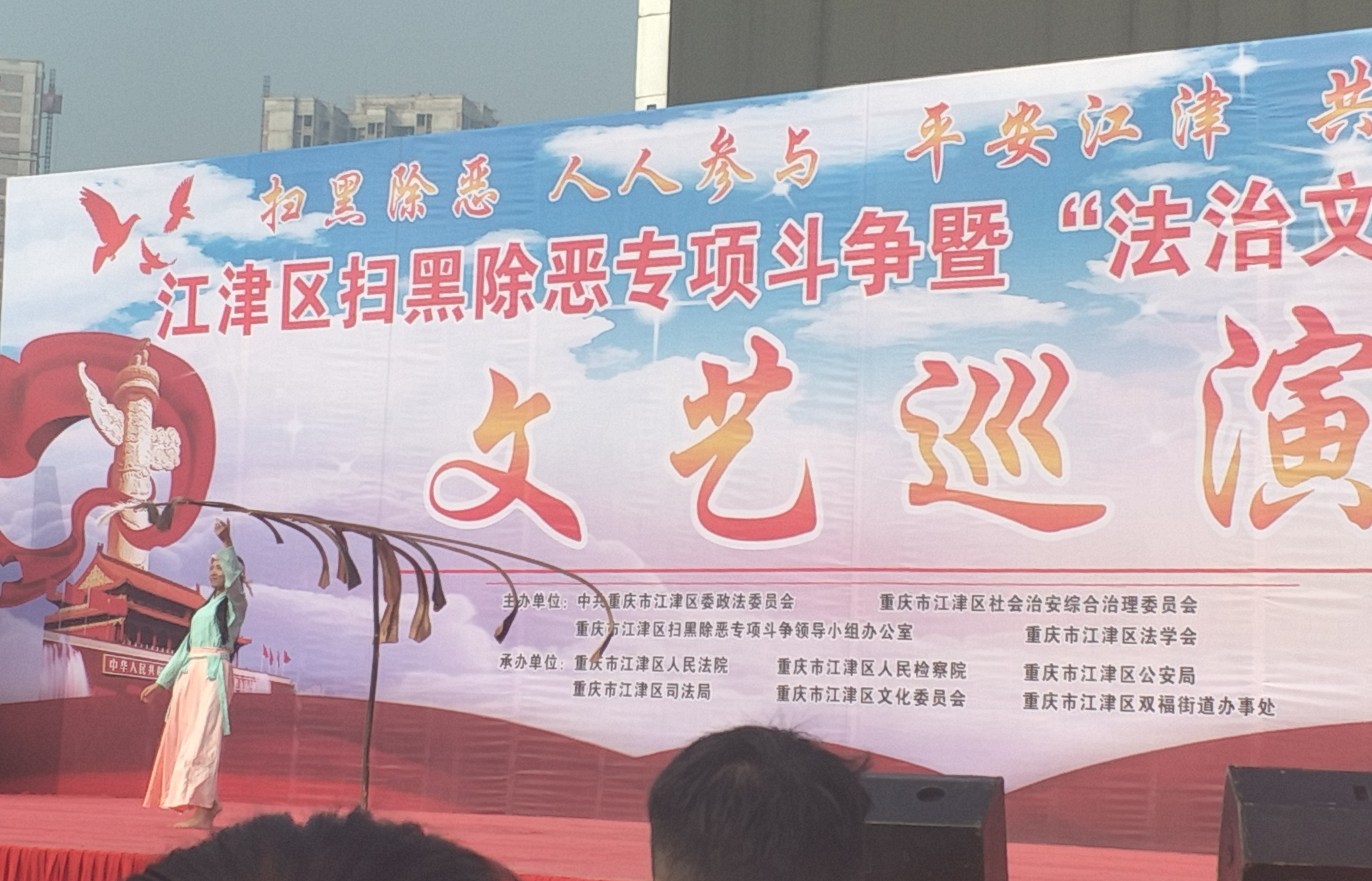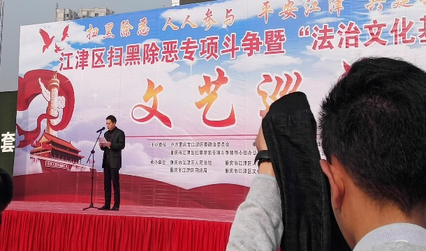 为了进一步提高同学们的扫黑除恶意识,提高自我保护能力和防范诈骗能力。包括我系7名干部在内的28名团干部在老师的带队下于2018年10月31日9:00在双福时代广场观看江津区“法治文化基层行”的演出活动。