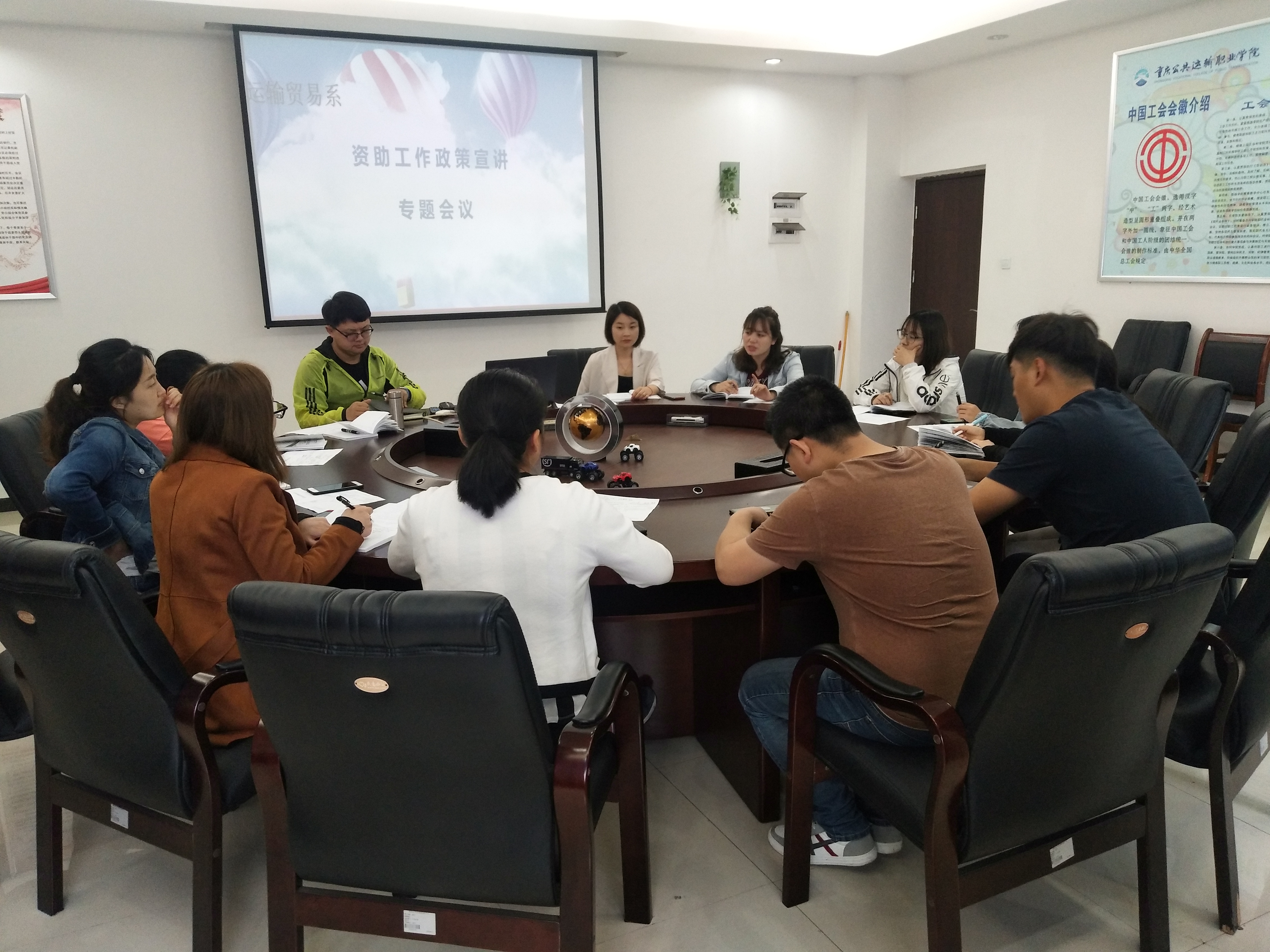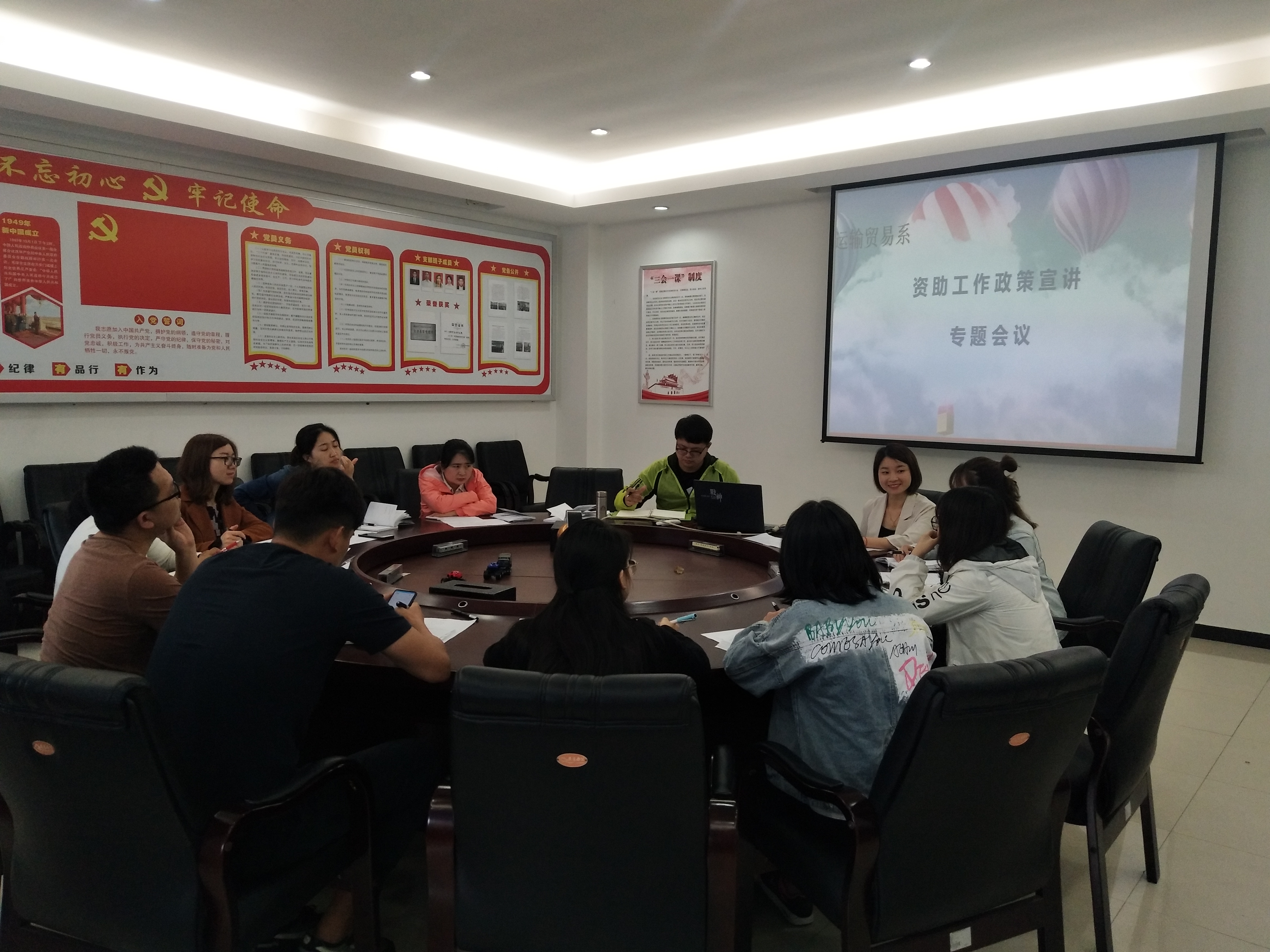 2019年5月8上午10:00由我系辅导员杨莉同志主持召开运输贸易系第九次学工例会,本次学工例会专题研究学院资助工作相关政策,运输贸易系系主任赵柱文、学工办主任古曼筝,全体辅导员老师参会。