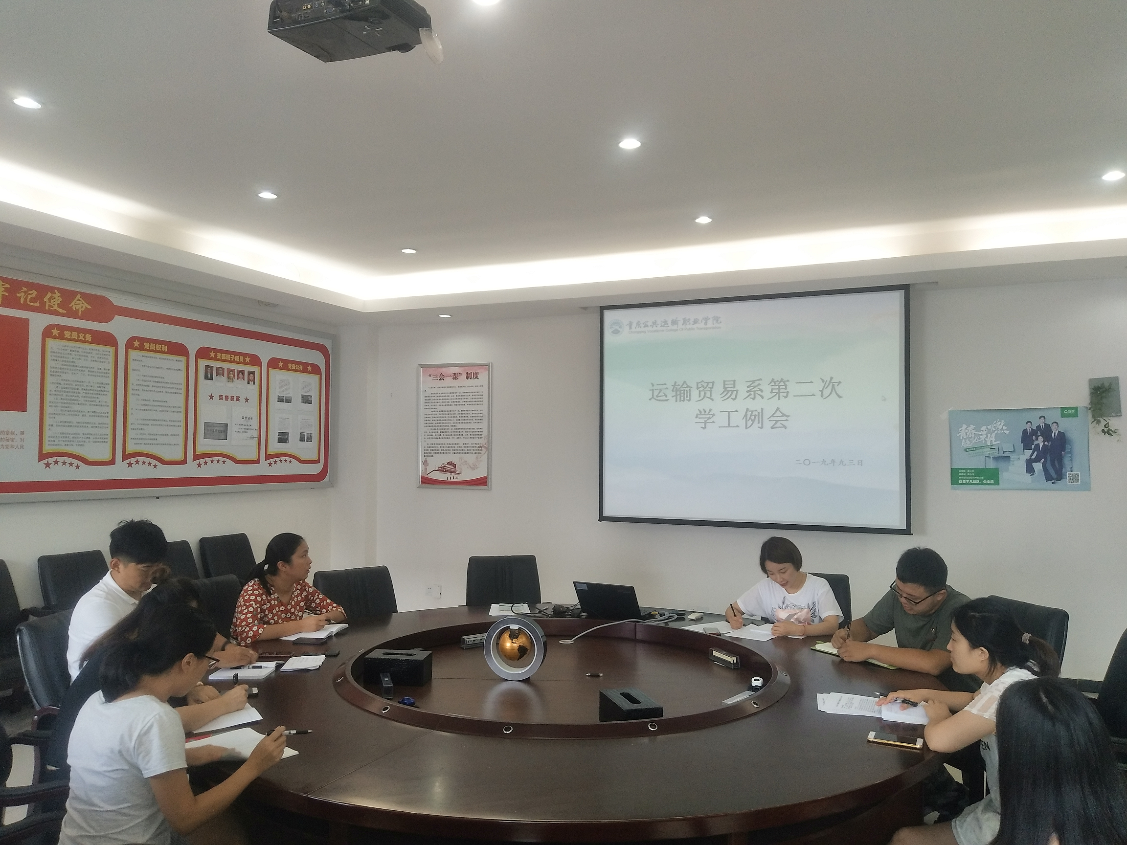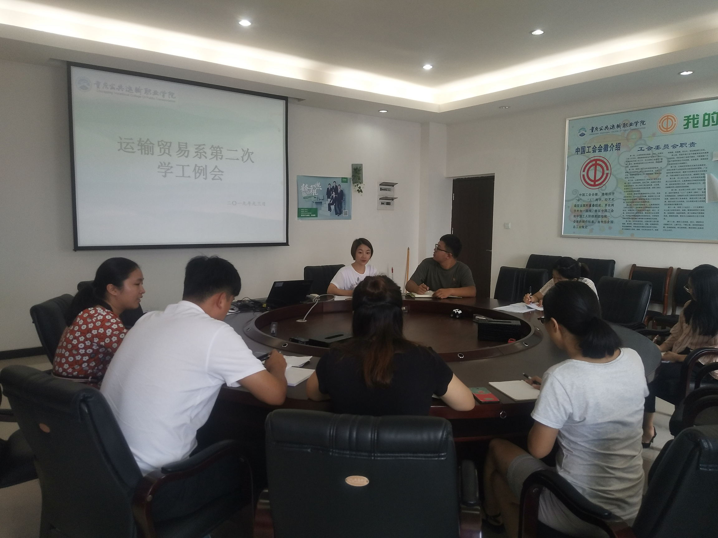 2019年9月3上午10:20由学工办主任古曼筝同志在A508会议室主持召开运输贸易系新学年第二次学工例会,本次学工例会统一部署了近期工作,运输贸易系全体辅导员老师参会。