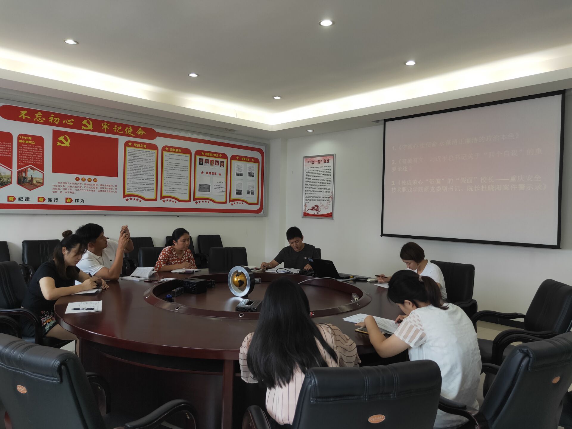 会上,曹宁老师带领大家学习《中共澳门正规电子游戏平台纪检委员会2019年廉政教育学习资料(八)》,首先学习了《守初心 担使命 永葆清正廉洁的政治本色》的文章,曹宁老师分板块强调了五个重点内容:1.破除思想误区,增强崇尚廉洁信念。2.提高政治站位,坚决做到“两个维护”。3. 坚定理想信念,强化廉洁从政道德修养。4.积极担当作为,全力服务振兴发展宏伟事业。5.增强使命意识,坚决扛起党风廉政建设责任。又学习了《有破有立,习近平总书记关于“四个自我”的重要论述》,要求党员同志要长期保持自我净化、自我完善、自我革新、自我提高的途径。最后学习了《被虚荣心“带偏”的“假面”校长——重庆安全技术职业学院原党委副书记、院长杜晓阳案件警示录》,警示录中杜晓阳丧失理想信念、丧失党性原则、丧失纪法敬畏、丧失道德底线,不但没有起到党员的先锋模范带头作用,反而败坏了党员形象,给党组织抹了黑,震撼了在座的党员同志,起到了警醒作用。