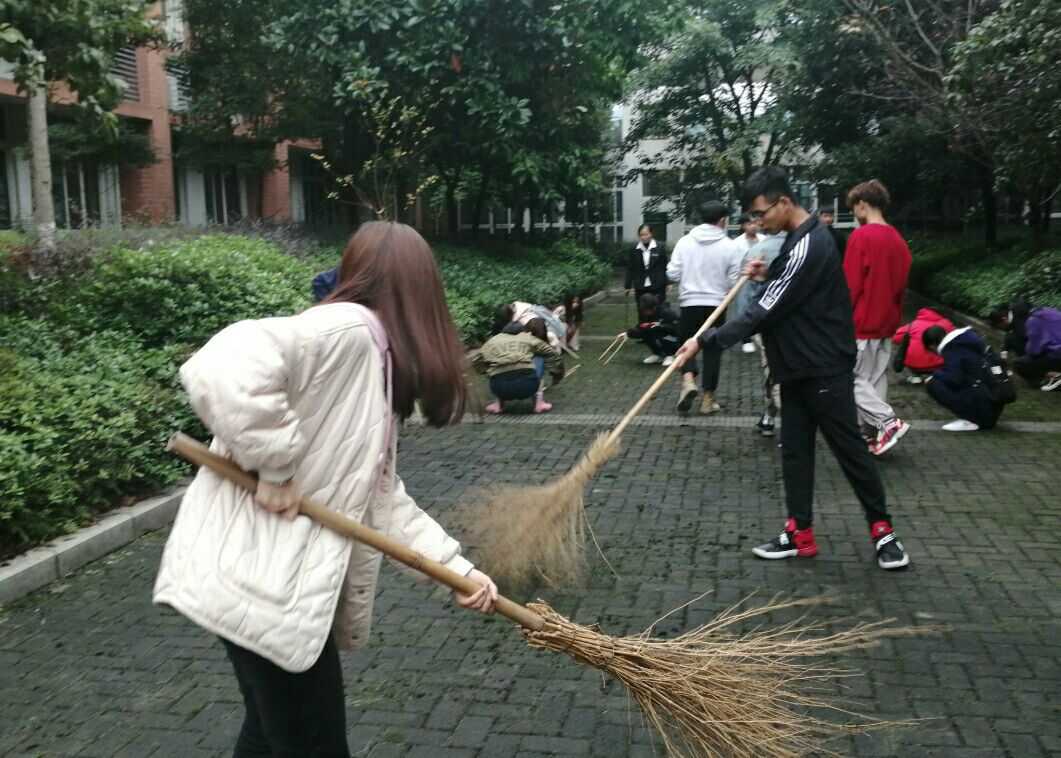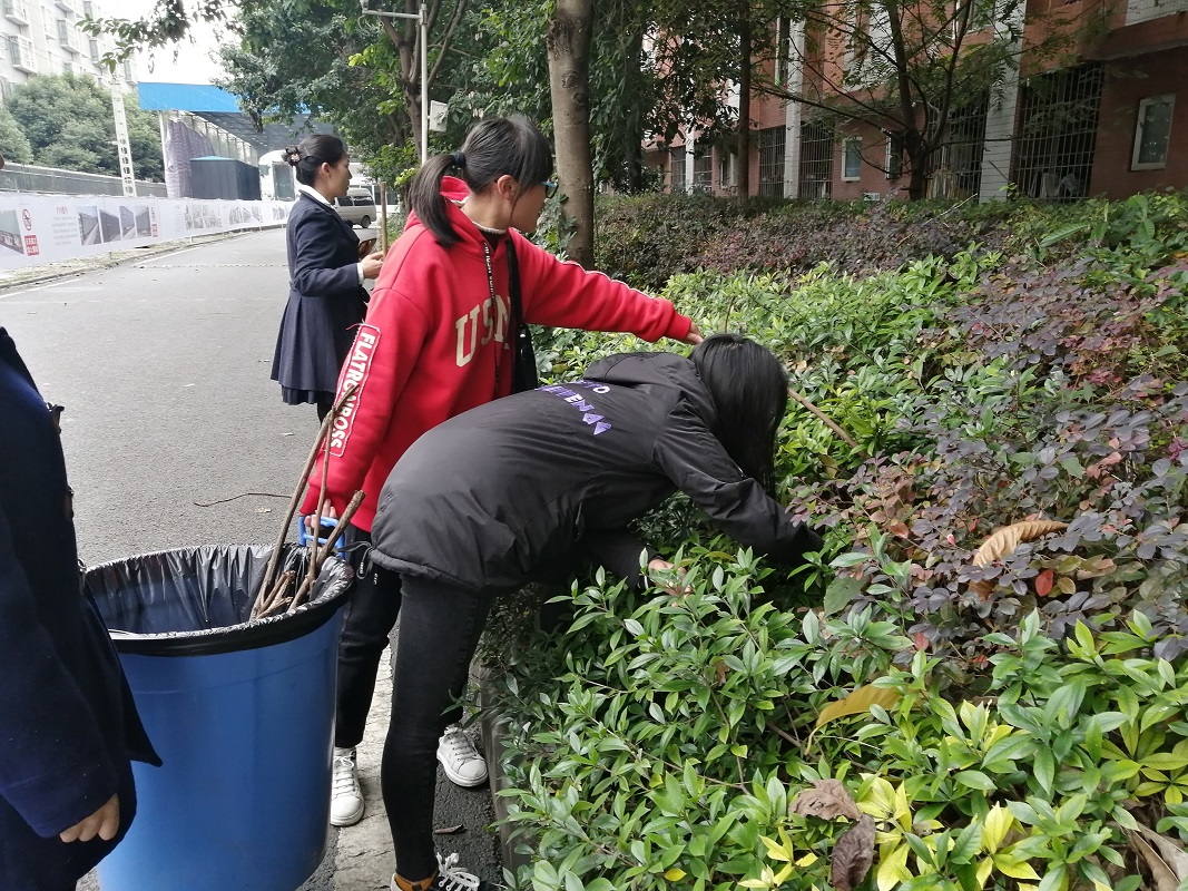 为加强校园文明建设工作,打造更好的校园文明风貌。2019年11月13日14:30由学院学生处主办,运输贸易系主持、配合正大物业工作人员组织学院学生开展以“花开暖心间,行动美校园”为主题的卫生清扫活动,我系若干名同学参加活动。