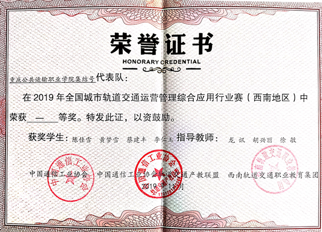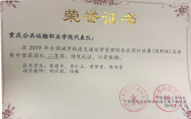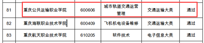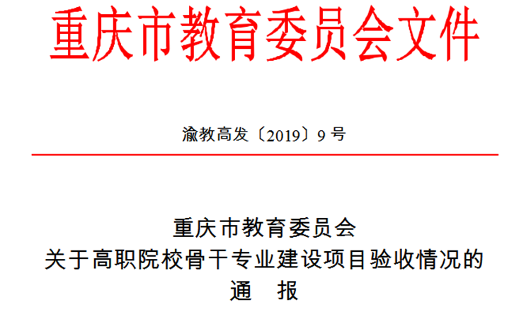 城市轨道交通运营管理市级骨干专业顺利通过重庆市教委验收,通过三年建设,新增校外实训基地7个,校内实训室6个,教师获批专利30余项,公开出版教材13部,获批教科研项目15项,发表论文60余篇,教师获市级以上奖项5项、全国性奖项1项,学生获全国性技能竞赛一等奖7项、二等奖3项、三等奖2项。