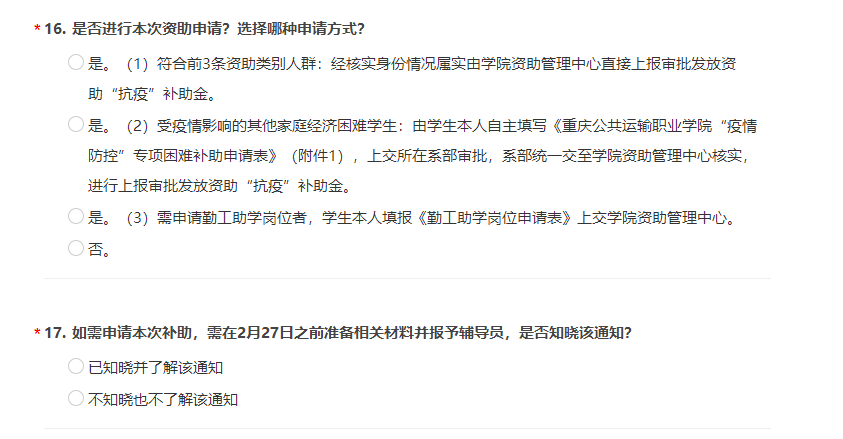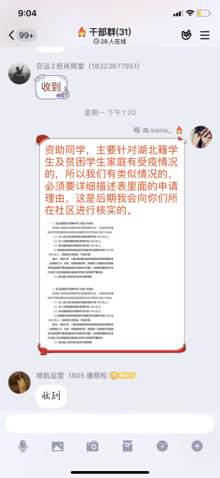 老师们通过微信,QQ,问卷星等方式及时及时传达资助文件精神,保证资助文件精神学生了解全覆盖。每日对所带班级困难学生跟踪统计,每日督促学生填报“防疫健康打卡”线上信息系统,及时掌握疫情期间学生动态数据,做到摸排信息不滞留、不耽搁、不拖延,及时上报、及时核查、及时处理。并且通过查阅学生系统数据库、困难学生数据库、家校联系及其他网络方式联系等方式全面排查所有学生,确保不漏一名困难学生,做到应助必助。针对政策咨询的同学老师们逐条向学生认真、细致的讲解与说明,让学生知晓符合自身的的资助政策。希望本次工作的开展能减轻贫困学生生活及心理压力,予以困难资助,帮助他们顺利度过疫情。