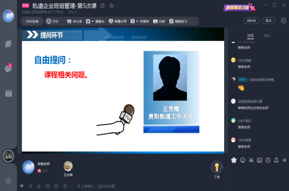 为了让学生了解更多轨道企业班组管理知识,拉近课堂教学与行业企业之间的距离,邹雄老师邀请轨道线企业一线员工加入在线课堂,通过远程直播连线的方式与同学们进行在线交流,解答同学们的疑问,让学生了解到来自企业一线的专业知识,是产教融合下的校企合作式教学的一种新尝试。