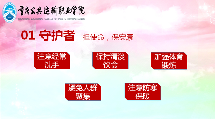 本次班会以“科学防控战疫情·健身健心迎春晖”为主题,结合当前疫情防控形势,引导学生学会感恩、并传递感恩,教育学生积极响应疫情期间教育部给全国大学生的一封信中关于“守护者、修行者、识途者”三个身份的定位和践行。