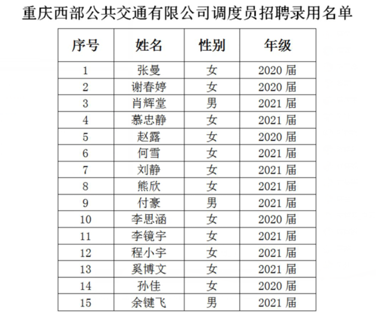 运输贸易学院 学院概况 工作动态 专业设置 教学科研 党建工作 学生工作 就业创业 实训建设 供应链学院 下载专区 工作动态首页 > 运输贸易学院 > 工作动态 > 运输贸易学院15名同学被西部公交录用 来源:工作动态发布时间:2020-11-25 12:20访问量: 经过笔试、面试等多轮考察筛选,重庆交通开投集团所属澳门正规电子游戏平台运输贸易学院(智慧供应链学院)15名同学,近日以优异成绩被重庆公交控股所属西部公交公司运营调度岗位成功录用。 据悉,西部公交公司是重庆公交控股集团所属国有全资控股公司。此次录用的15个同学的工作岗位,包括运营调度正式工作岗位5个、实习工作岗位10个。