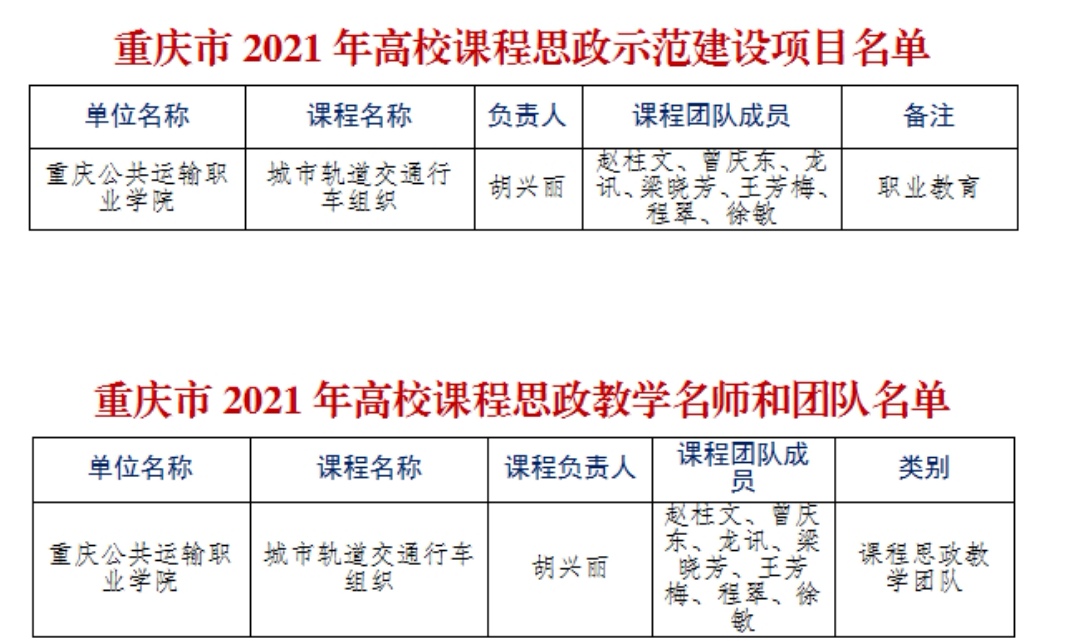 重庆市教委4月17日发出专门通知,公布2021年高校课程思政示范建设项目名单,重庆交通开投集团所属重庆公共运输职院榜上有名,《城市轨道交通行车组织》课程成功入选高校课程思政示范建设项目,授课团队根据教育部文件规定,被认定为课程思政教学名师与教学团队。