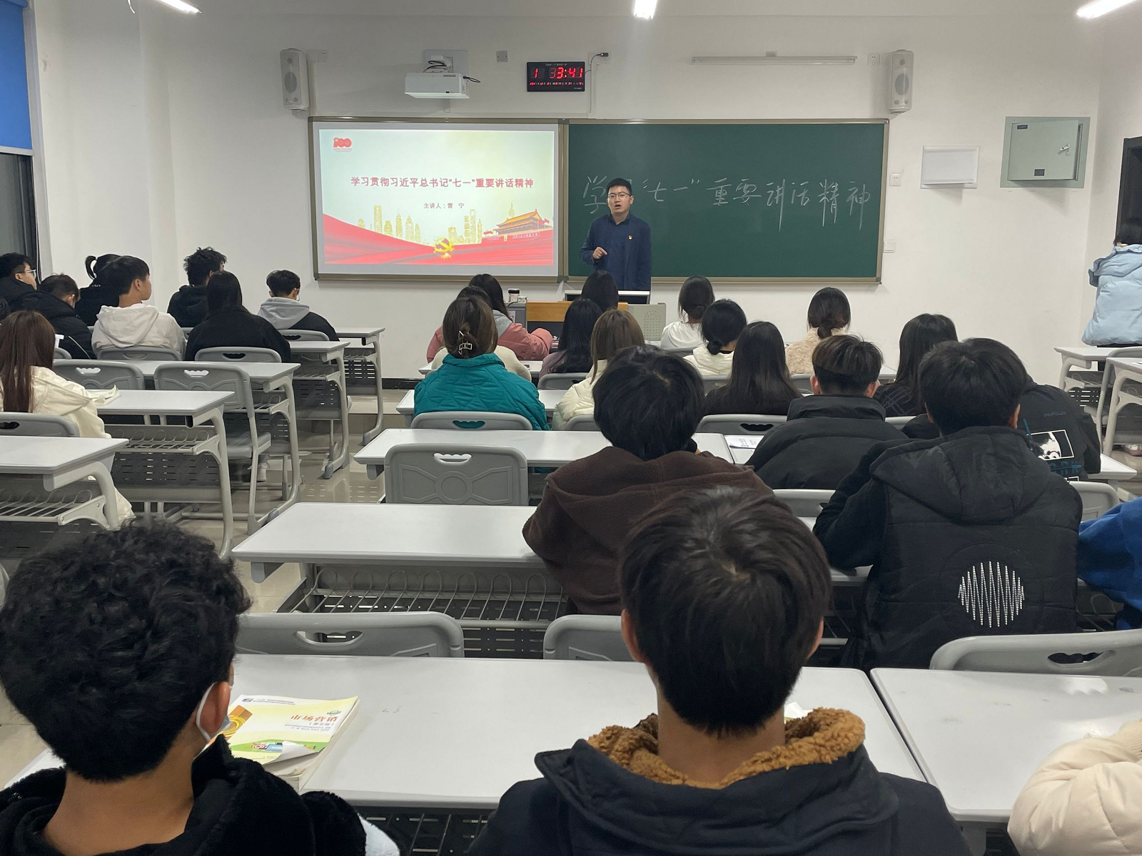 12月8日19:00,运输贸易学院学生党支部在新校区教学楼A302教室,举办学习贯彻习近平总书记“七一”重要讲话精神“进校园”宣讲活动。