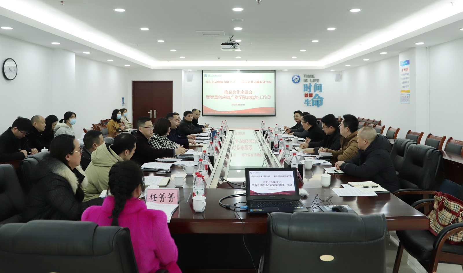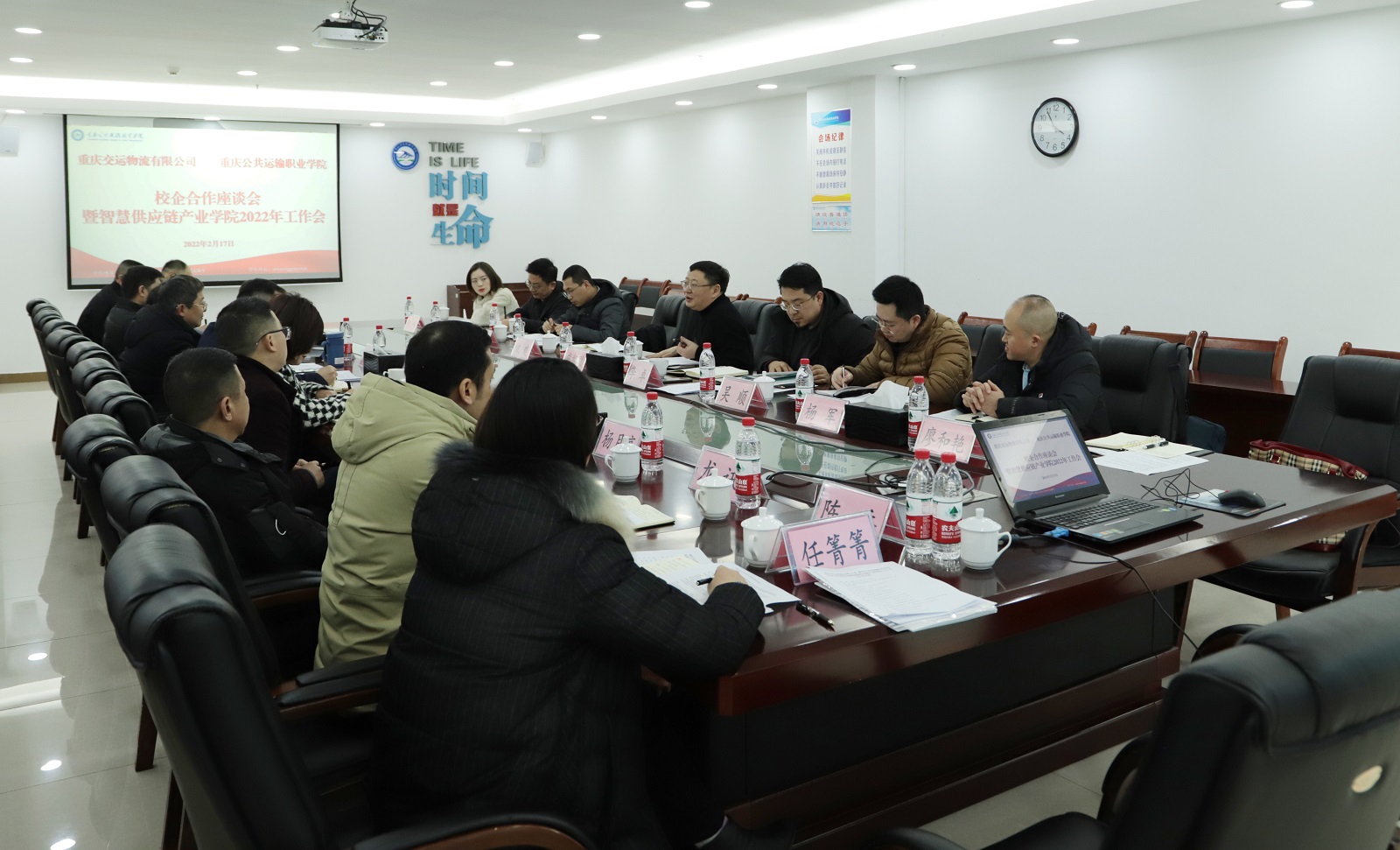 在此之前,学校和重庆交运物流有限公司在学校科学城主校区办公楼507会议室召开了一次校企合作座谈暨智慧供应链产业学院工作会。会上,交运物流公司总经理熊智刚,学校党委副书记、副校长李灿等校企双方代表,围绕行业企业人才需求、人才培养方案优化、订单班学员能力培养、学生关切、订单班规模质量、行业培训标准化建设、2022年重点工作等方面进行研讨交流。