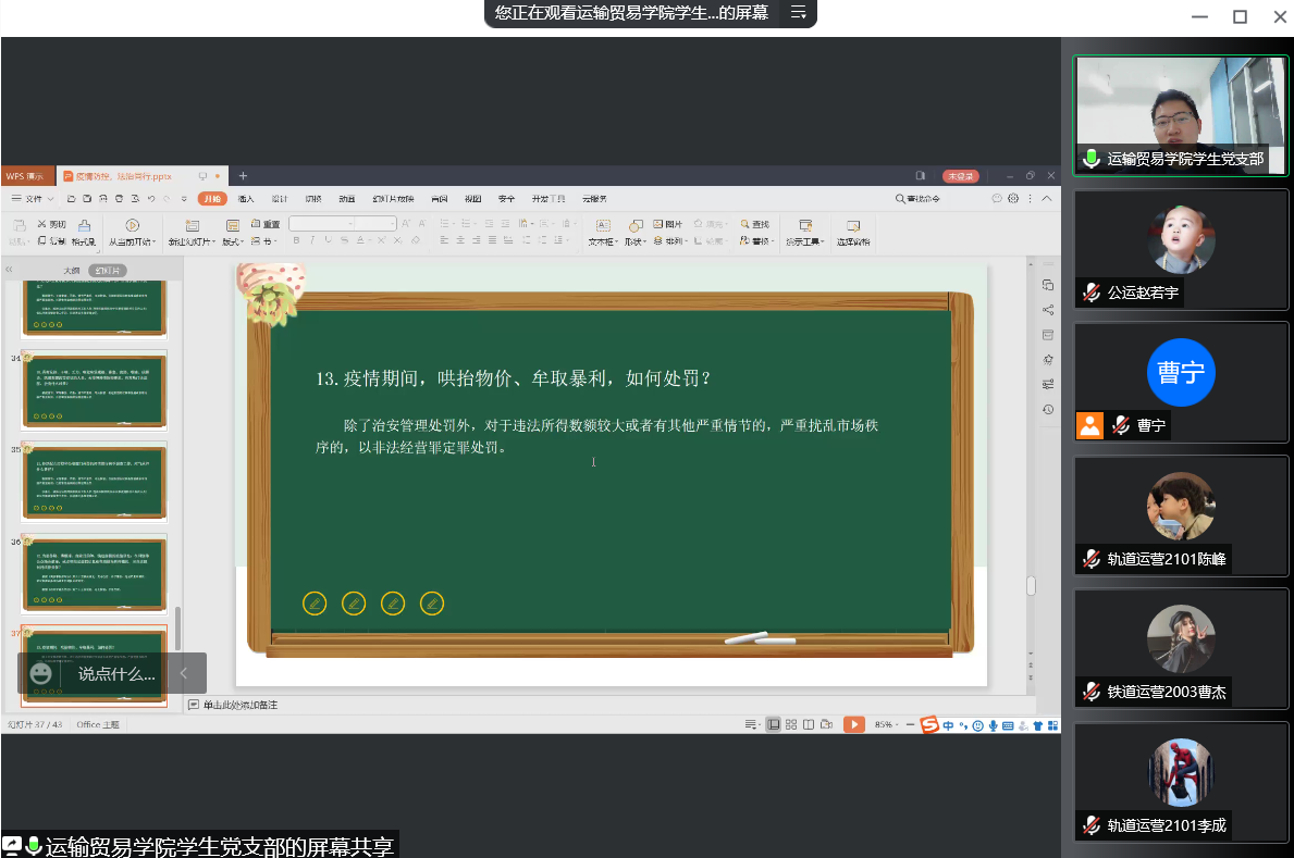 近日,为深入落实学校疫情防控部署,做好新型冠状病毒感染的肺炎疫情防控法治宣传工作,运输贸易学院学生党支部书记曹宁同志于3月23日19:00,以线上上课形式积极开展“疫情防控、法治同行”专题法治宣传教育活动,为本校疫情防控工作开好头、布好局营造了良好的法治氛围。