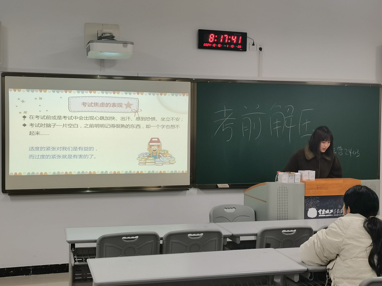 随着期末考试临近,有些学生面临学业和考试压力,会产生一些焦虑、不安等负面情绪。为了帮助学生调整心态,减轻压力,提升自信心,在2024年12月16日,铁道运营2403班开展了“考前解压”主题班会。