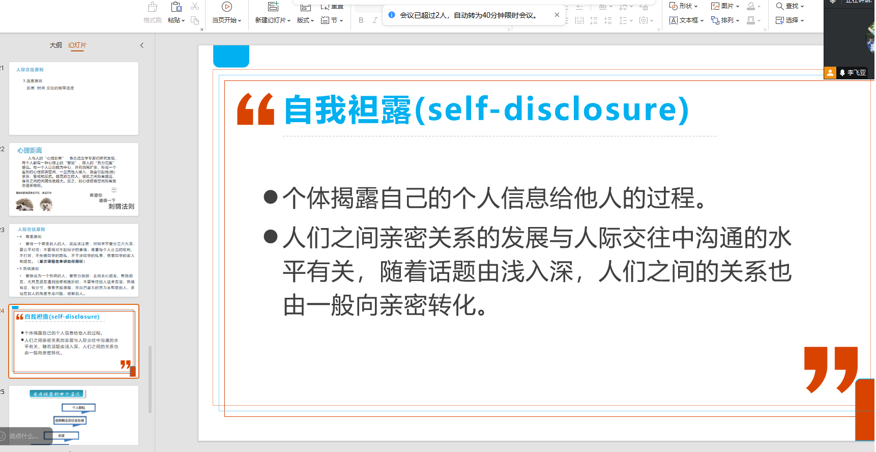 为进一步推进新时代大学生的良性发展,增强当代大学生交际能力,改善其人际关系。辅导员李飞亚老师于3月9日开展了《创造你的人际关系》的主题宣讲。