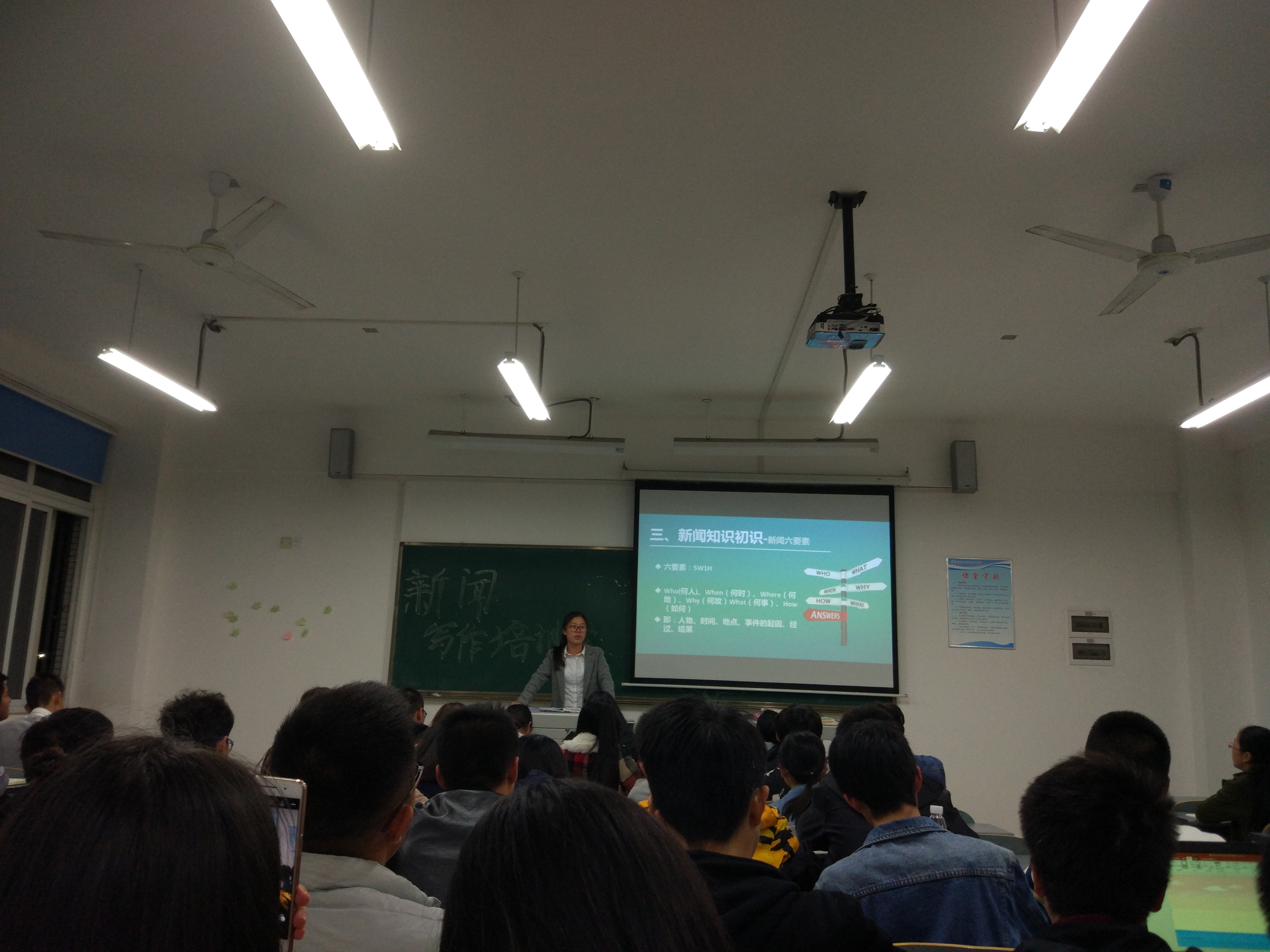 理论和实践相结合。本次培训会议杜康老师允许同学们自由使用手机拍照,也可以自由行走拍摄新闻现场,活学活用。讲解到重点之处,如5W1H、新闻标题等知识,杜康老师要求同学们定时写作,学以致用,通过现场写作保证新闻的时效性。