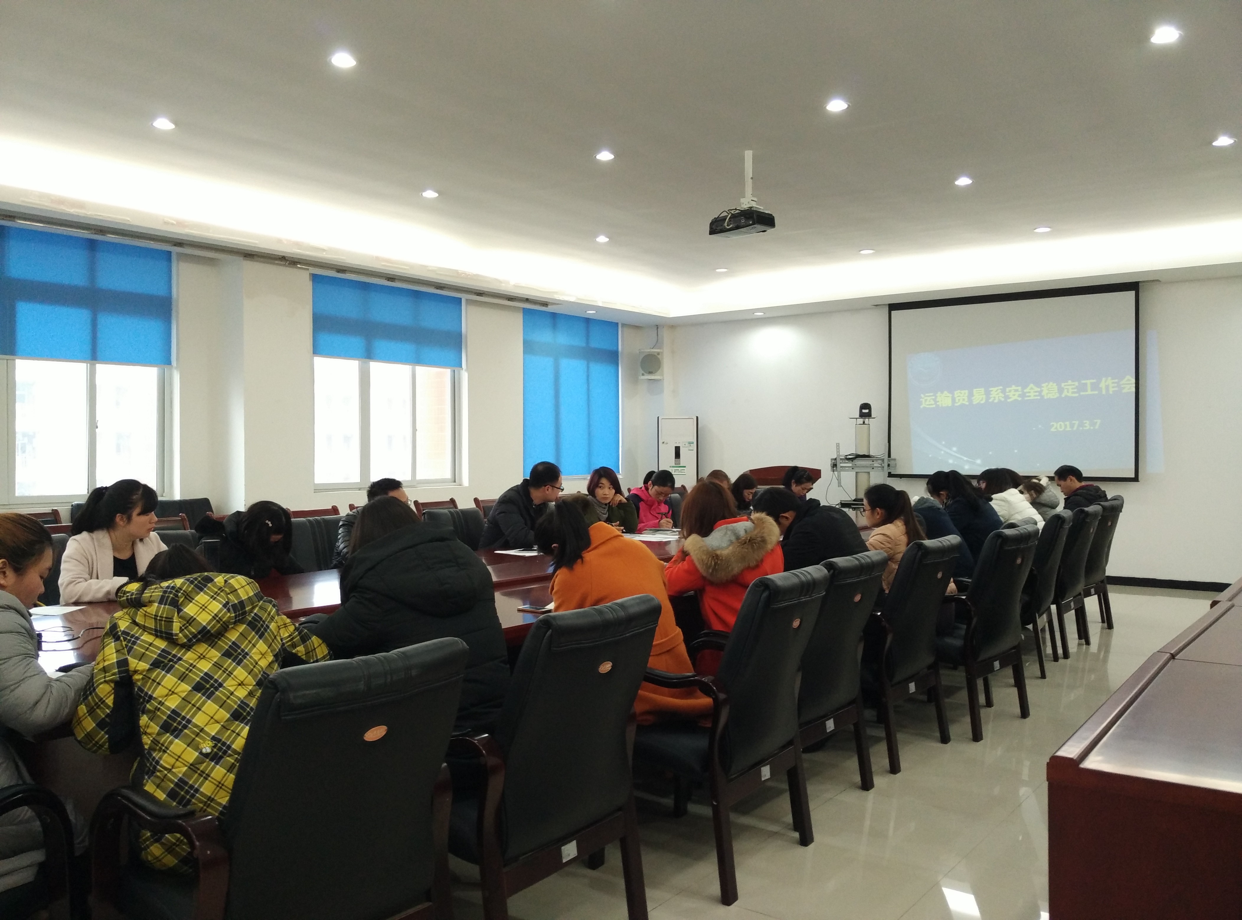 2017年3月7日,运输贸易系全体职工,在教学楼A402召开了运输贸易系安全稳定工作会。本次会议由党支部书记曾庆东主持,主要是对邱发胜校长参加2月27日市教育系统安全稳定工作的会议精神进行学习和传达,确保安全稳定工作在系部的具体落地。