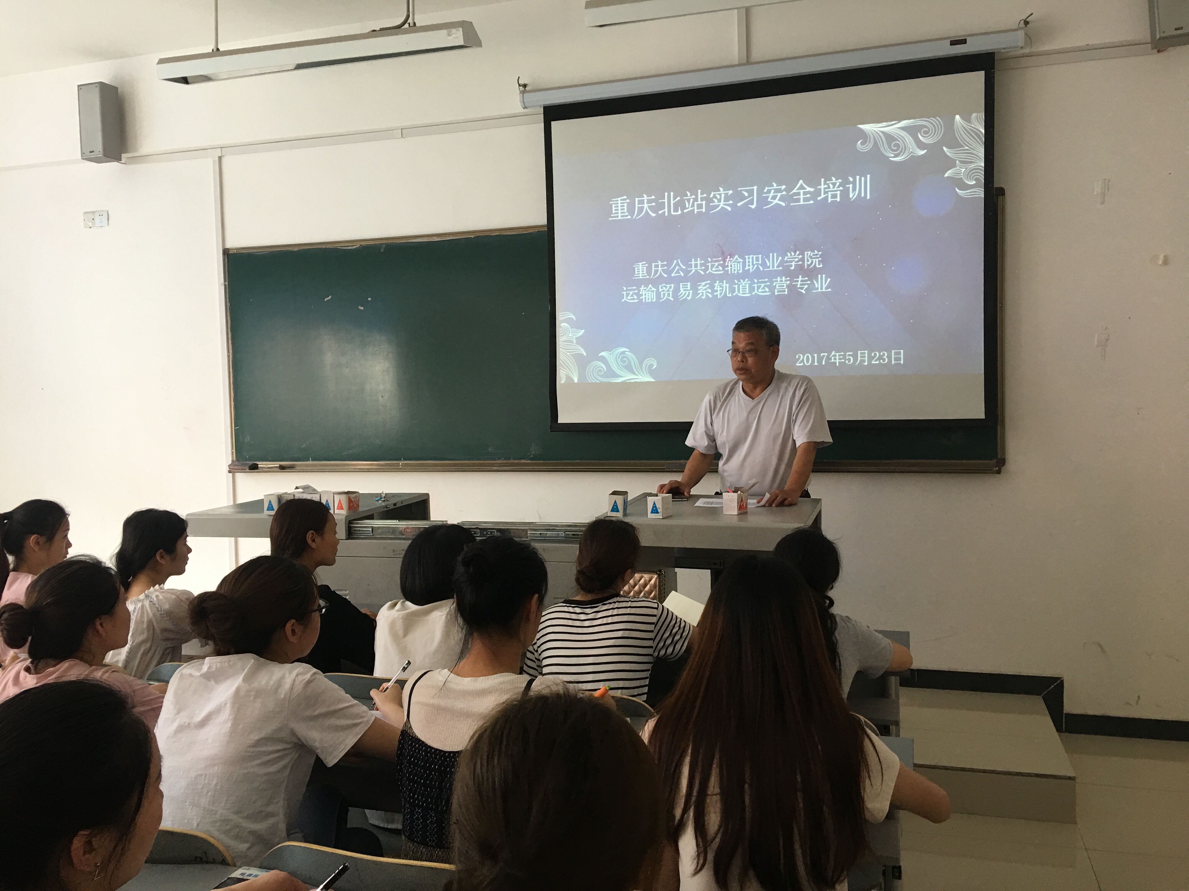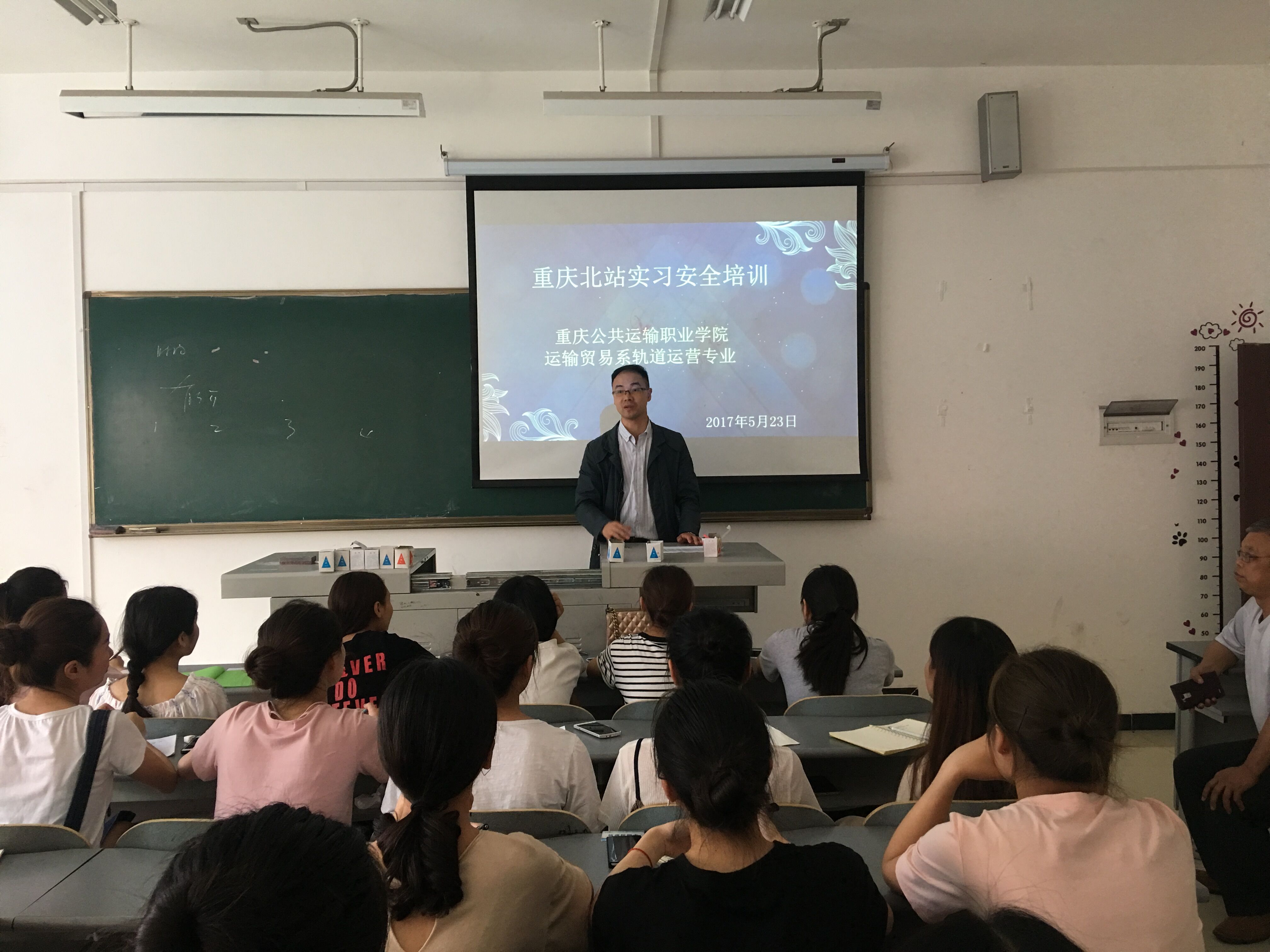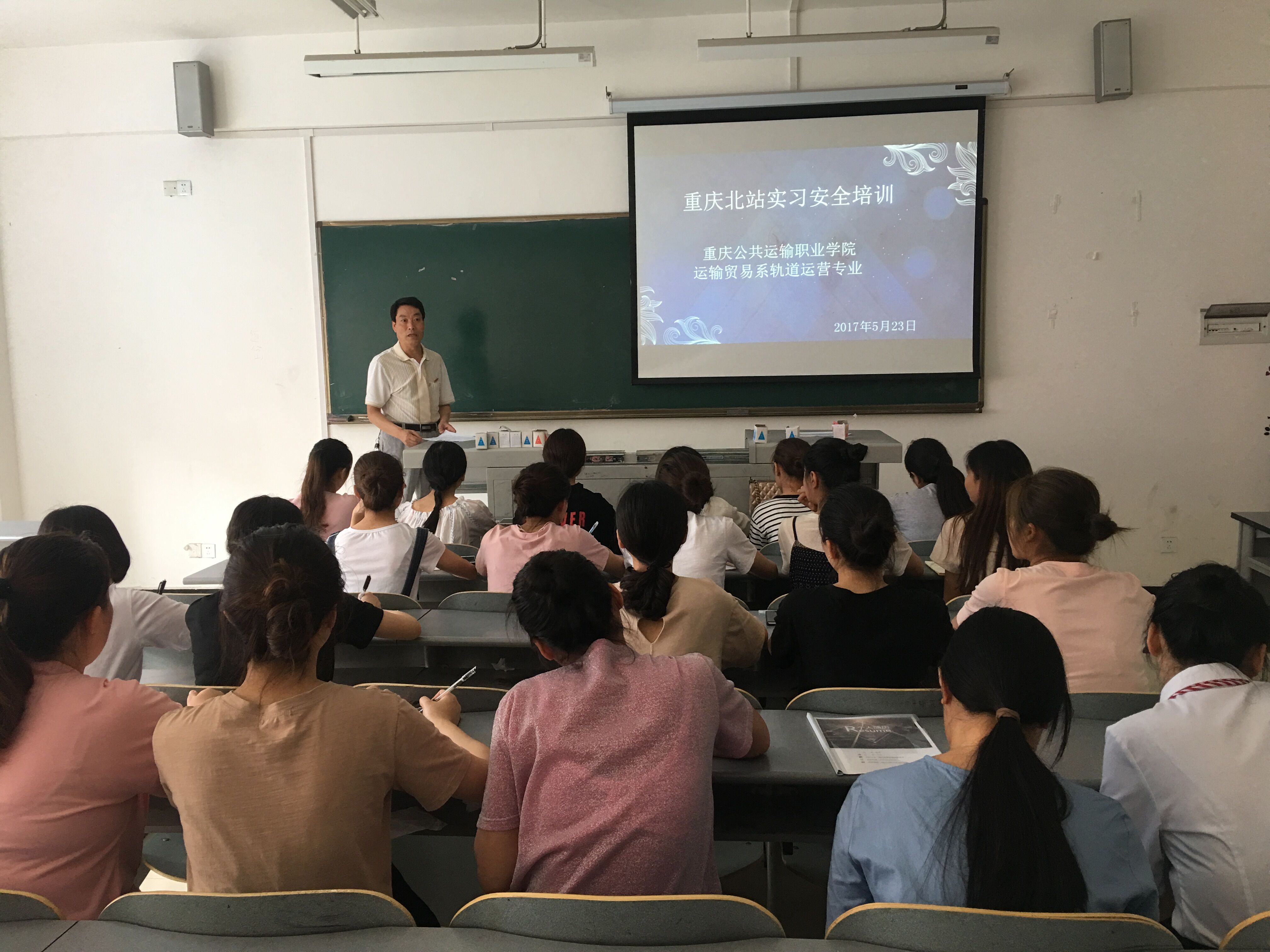 2017年5月23日13:00,成都铁路局重庆客运段北广场实习生临行前的安全培训会在教学楼B310召开,运输贸易系党支部书记曾庆东、招生就业处老师黎光全、铁道专业负责人胡发龙、辅导员钟馨怡、杨莉老师前来为临行的同学们嘱托安全。