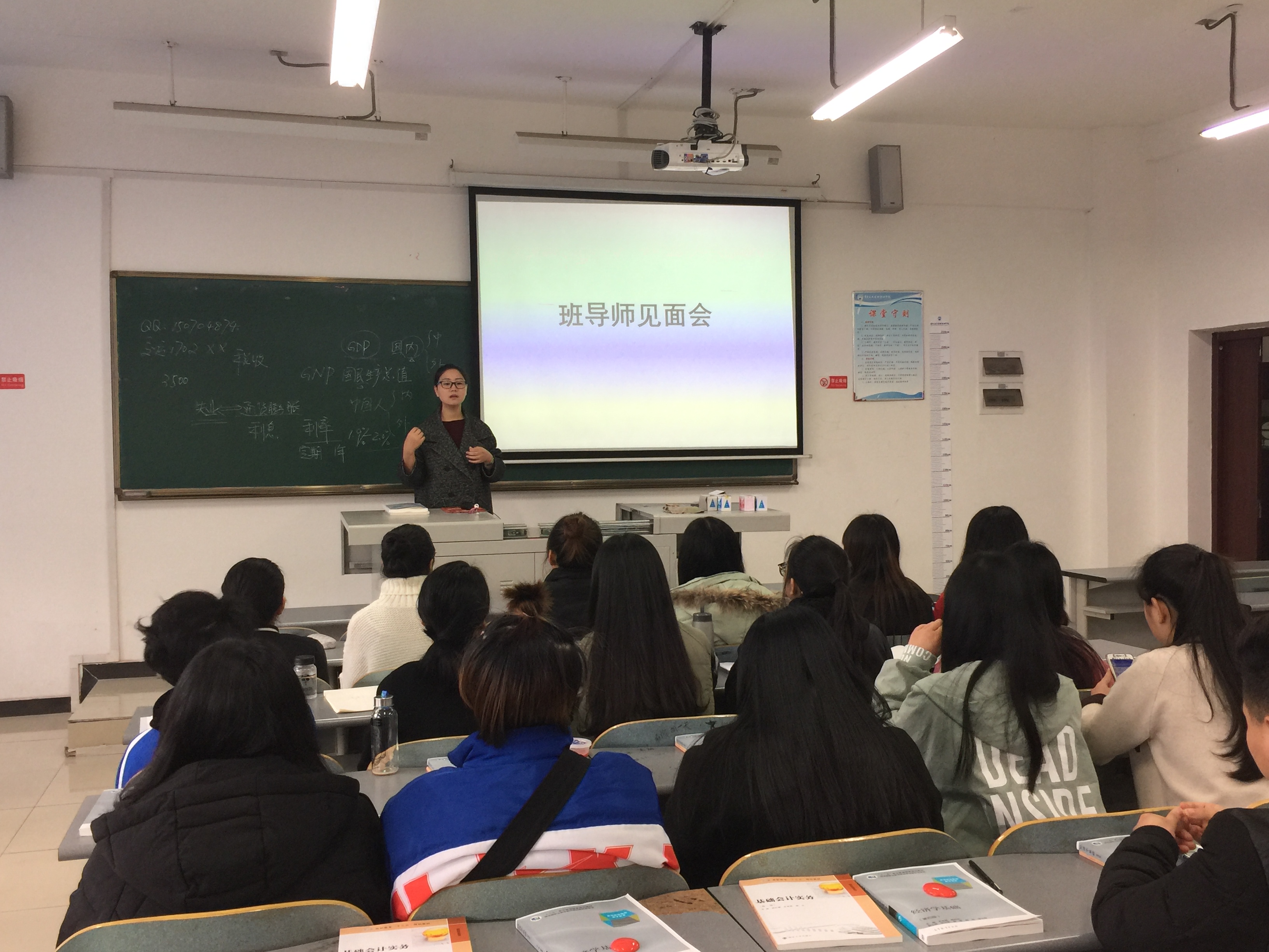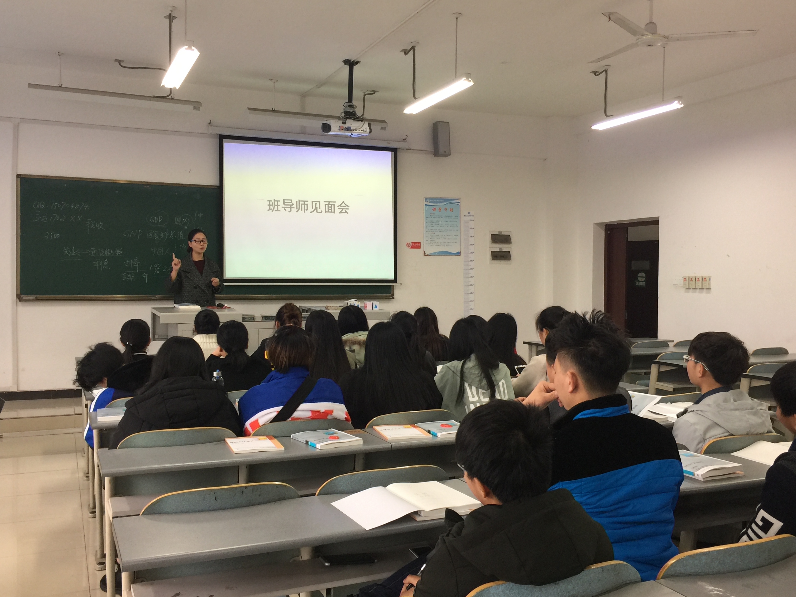 随后陈老师向大家说明了本学期班导师的工作计划。三月是开学第一个月,主要任务是端正同学们的学习态度;四月学院活动较多,鼓励同学们积极参加活动,大胆创新,同时学习不落下,迎接半期考试;五月主要了解学生的思想状态;六月做好期末应考教育和英语等级考试应考教育。