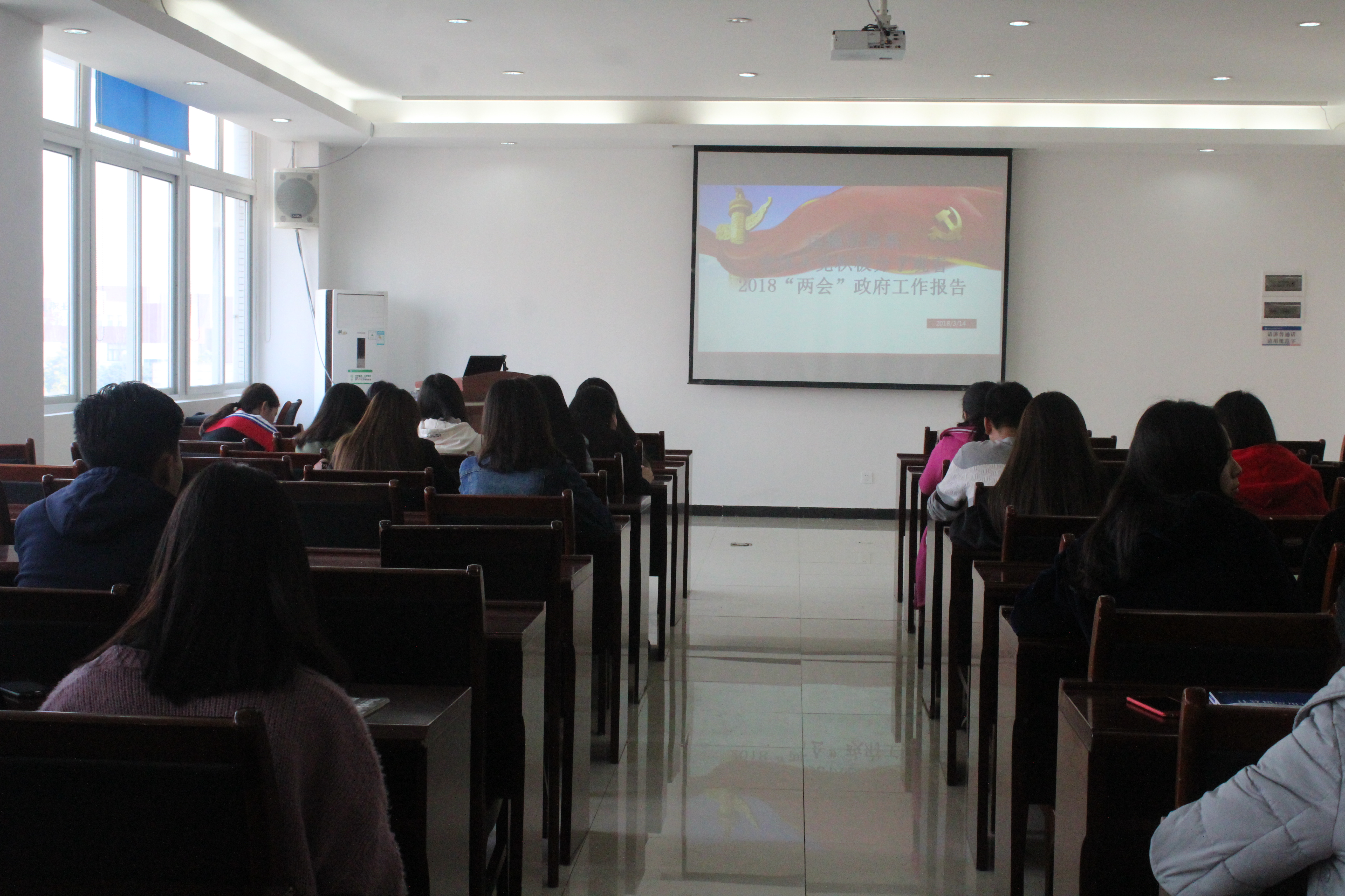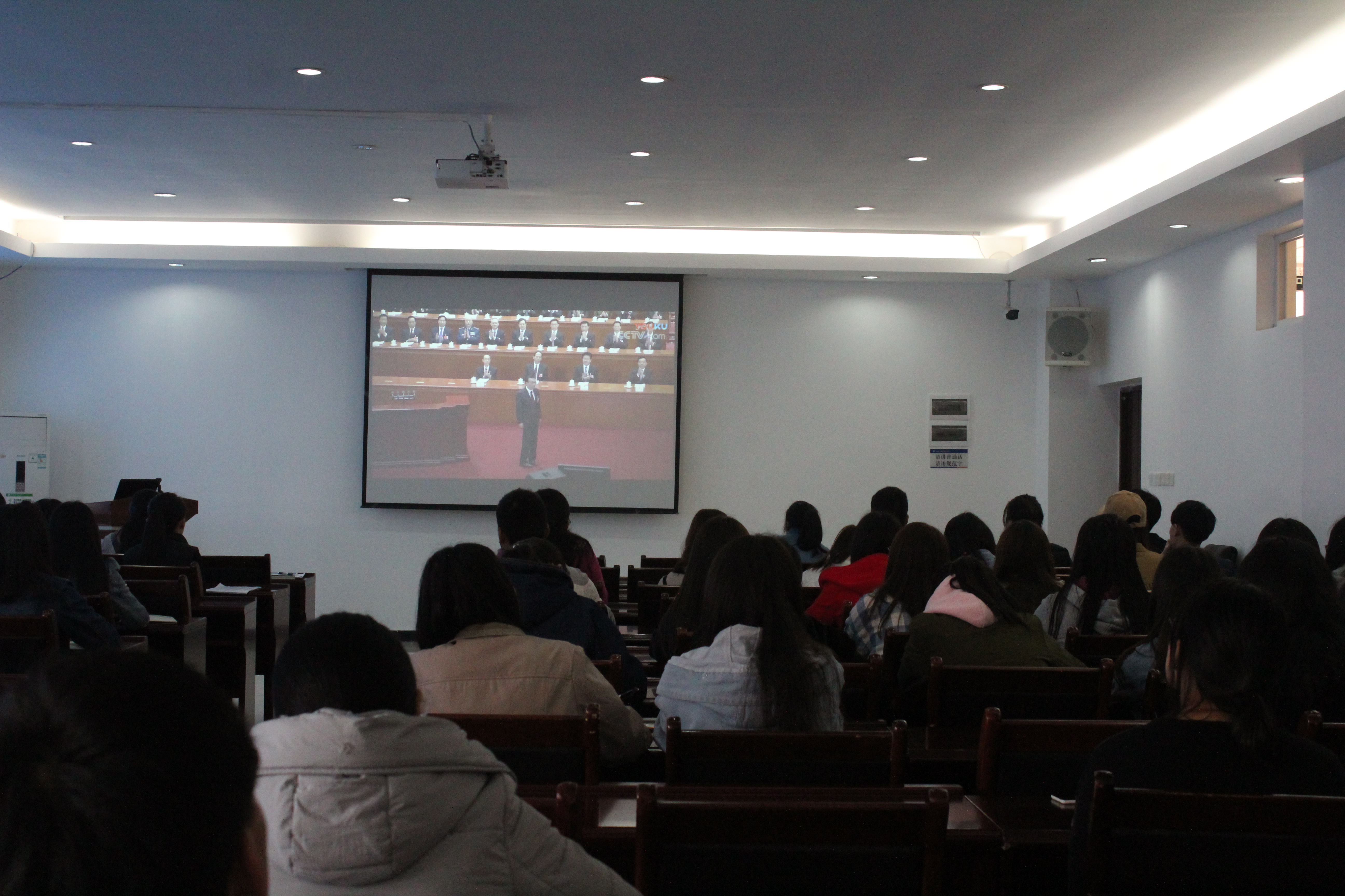 3月14日澳门正规电子游戏平台运输贸易系党支部于13点20分在教学楼A403组织本系全体入党积极分子观看2018年“两会”政府工作报告。其他学生骨干在会议室、宿舍通过网络频道、微信平台等渠道了解会议动态,传递会议好声音。