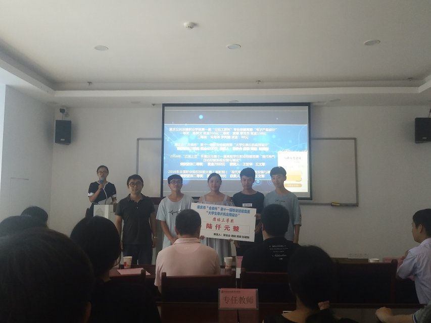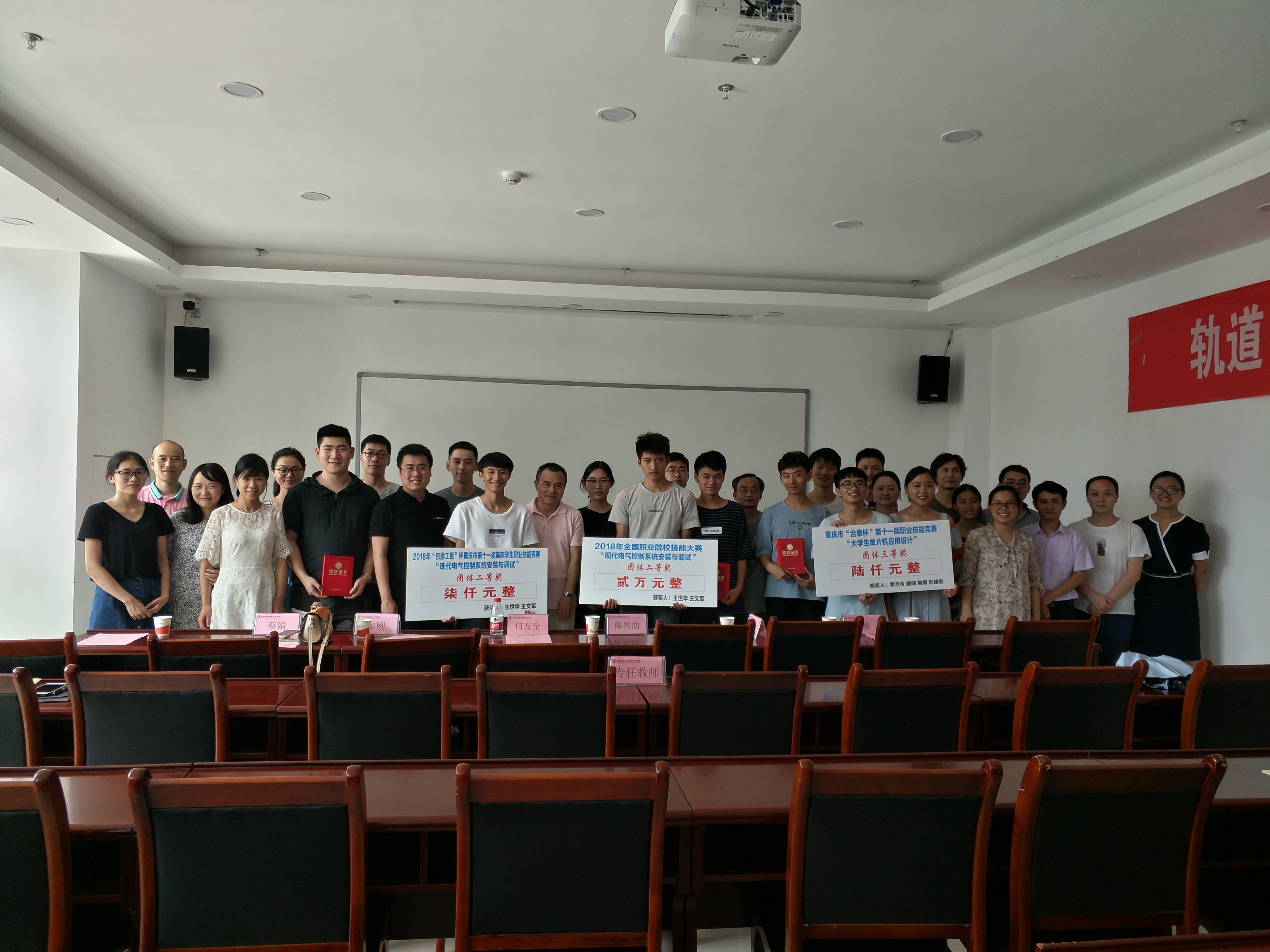 会上,陈兴劼主任宣读了《轨道电气系关于表彰2017-2018学年第二学期国赛、市赛、院赛获奖学生的决定》文件,激发了在座学生参与各项竞赛的积极性。陈兴劼主任,牟刚主任、蔡娟老师及邓勇老师分别为获奖学生和指导教师颁发了荣誉证书和奖金。王文军同学和龚清林老师分别作为代表发言,对优异成绩的取得表达了欣喜和肯定,对大家的辛勤付出表示了感谢。冉威威同学代表38名卓越班学子表示,在今后的学习中再接再厉,发扬不怕吃苦、开拓创新的“工匠精神”。最后, 何友全主任总结致辞,对全体学生和老师提出了高标准严要求。