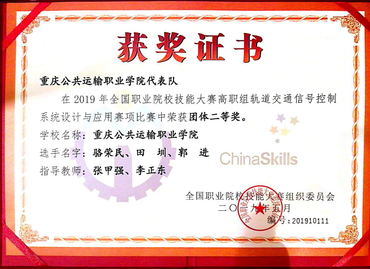 6月2日,由教育部主办的2019年全国职业院校技能大赛高职组“轨道交通信号控制系统设计与应用”赛项在吉林铁道职业技术学院举行。我系卓越通号班学生骆荣民、田圳、郭进组成的参赛队荣获二等奖。排名西南地区所有参赛队第一名,也是重庆市在该赛项取得的历史最好成绩。