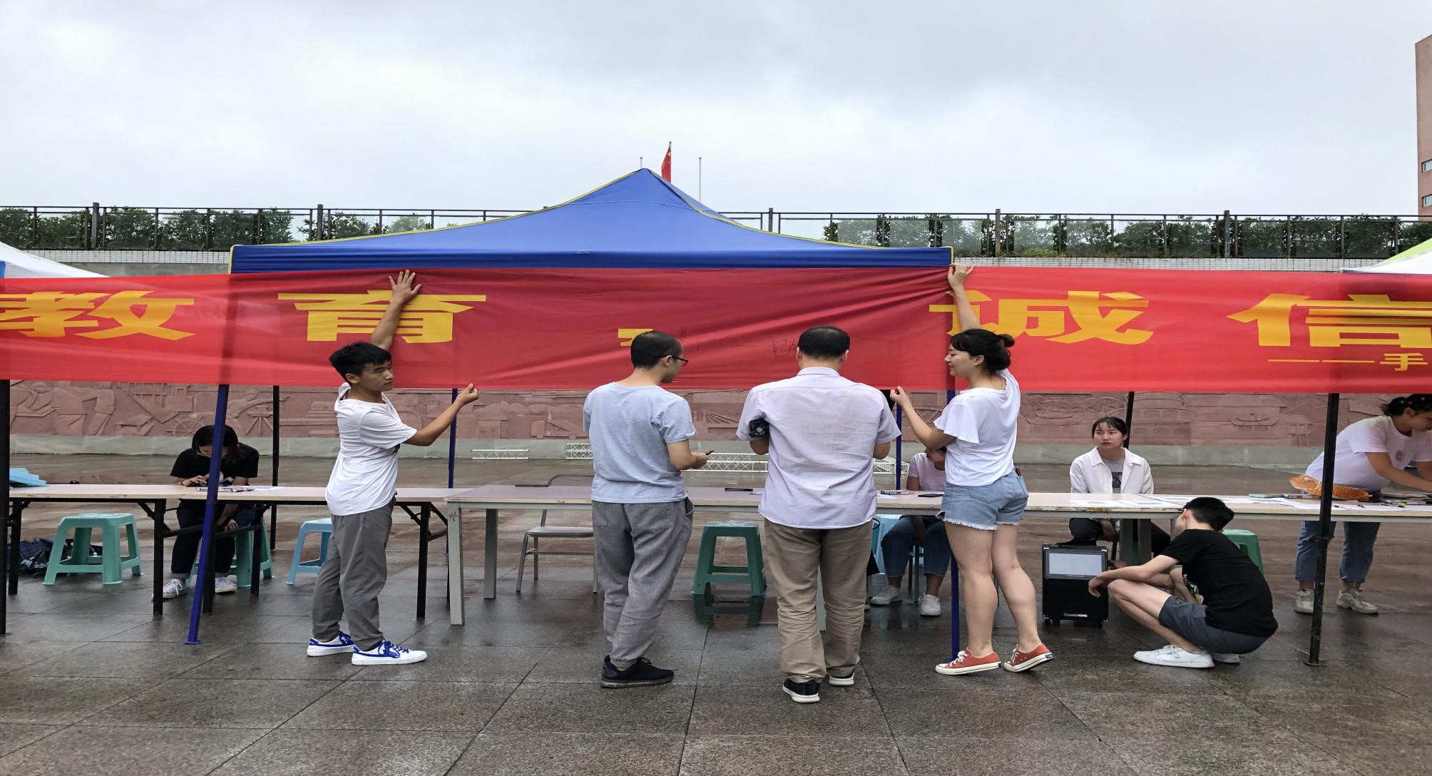 2019年7月4日中午12:40,轨道电气系团总支学生会在浮雕广场开展“倡导诚信考试、建立和谐校园”的横幅签名活动。学院纪委书记先白萍老师、财务总监郭祖红老师、安保处科长李云龙老师、电气系副书记郭昌盛老师、电气系学工办主任胥迅老师、团总支书记袁延涛老师,以及电气系全体辅导员和部分授课老师参