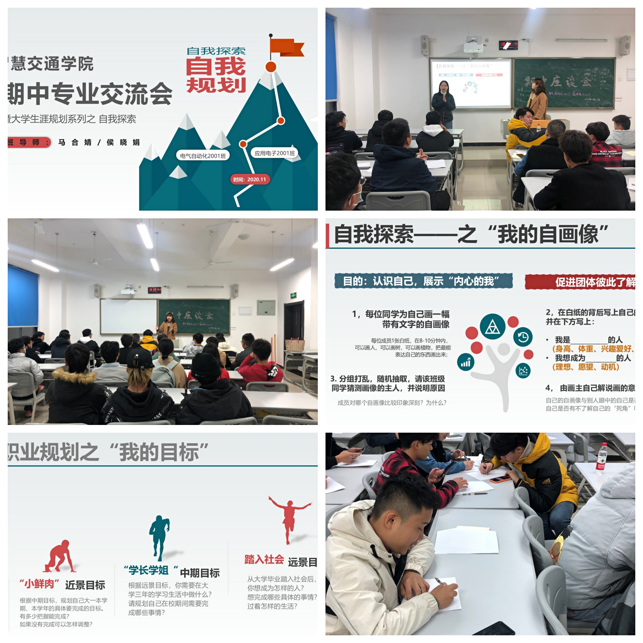 为推进师生交流,提升大学生职业心理素质,促进学生文化素质与身心素质的协调发展,2020年11月25日晚,智慧交通学院班导师马合婧、侯晓娟老师组织2020级电气自动化、应用电子专业全体学生在新校区B101开展了“期中交流座谈会” 暨自我探索系列主题班会。