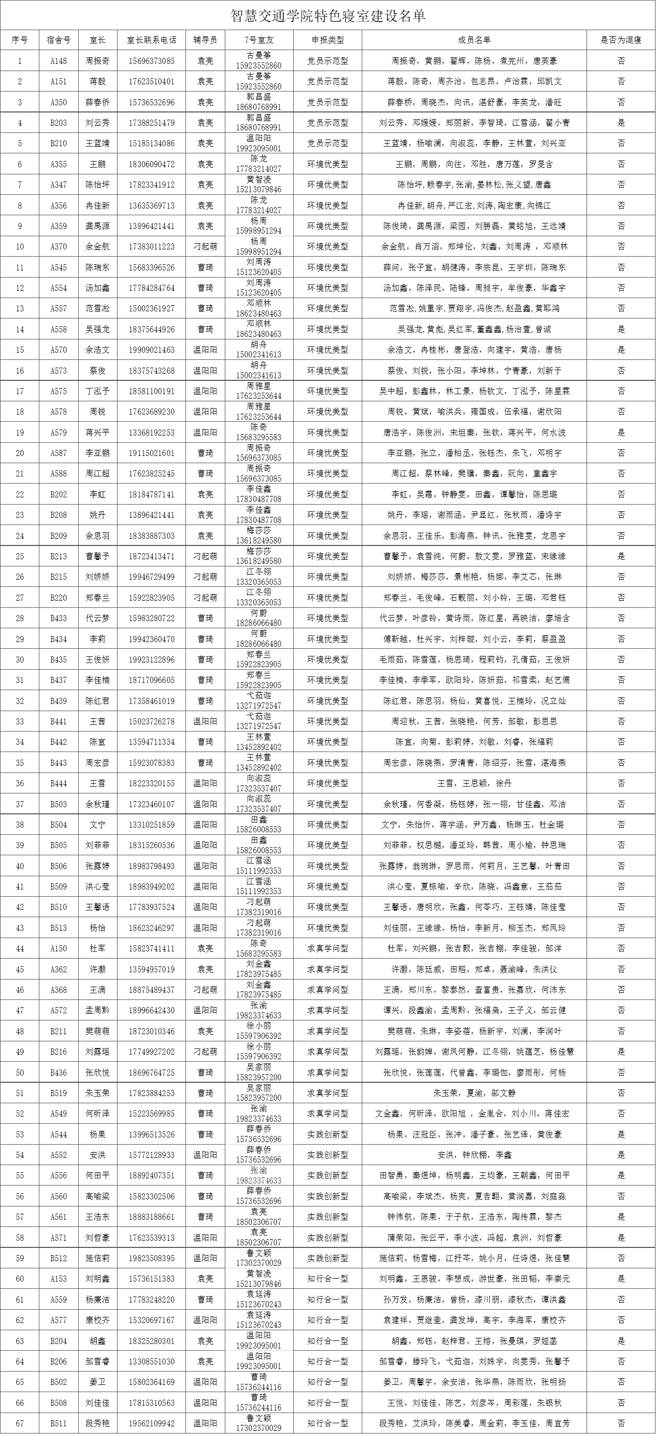 智慧交通学院 学院动态 专业介绍 师资队伍 党建动态 学工动态 就业指南 教学科研 学院动态首页 > 智慧交通学院 > 学院动态 > 智慧交通学院特色寝室建设名单 来源:学院动态发布时间:2021-10-14 13:47访问量: 经学生自主申请,学院考察后,现将智慧交通学院特色寝室建设名单(学生党支部”7号室友“对接建设名单)公布如下: