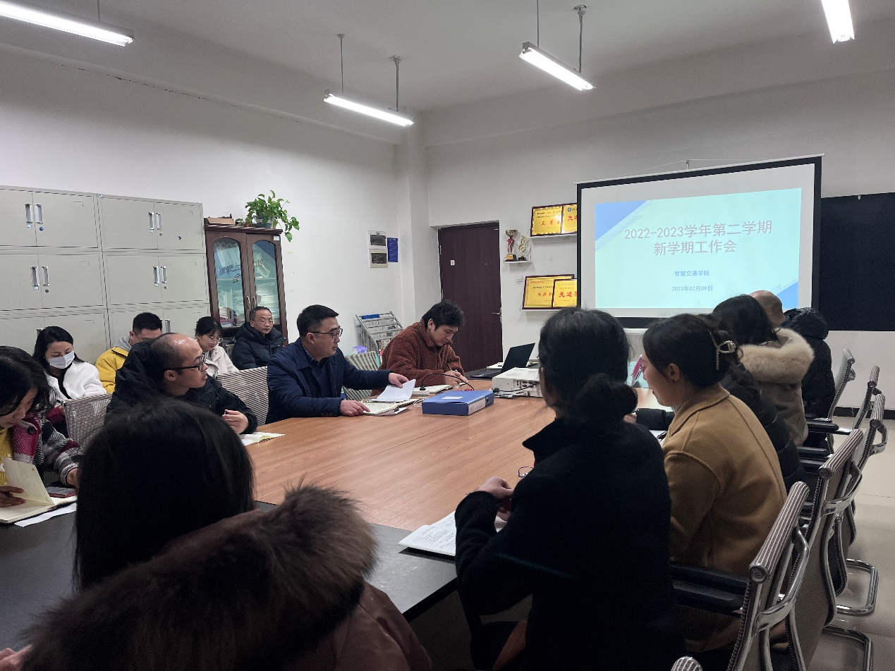 智慧交通学院 学院动态 专业介绍 师资队伍 党建动态 学工动态 就业指南 教学科研 学院动态首页 > 智慧交通学院 > 学院动态 > 智慧交通学院召开新学期工作会 来源:学院动态发布时间:2023-02-13 11:59访问量: 2月9日上午,智慧交通学院在学校主校区教学楼C101会议室召开2022-2023学年第二学期新学期工作会议,会议对2022年学院工作进行总结,部署2023年学院重点工作安排,聚焦学校“双高计划”和产教融合建设事业发展,力争在学院发展道路上不断创下新高绩。 智慧交通学院副院长牟刚、党总支书记郭昌盛围绕学院新学期发展阶段工作和党建工作进行了任务布置,提出相关工作要求。 会议由学院副院长牟刚主持,全体教职员工参会。