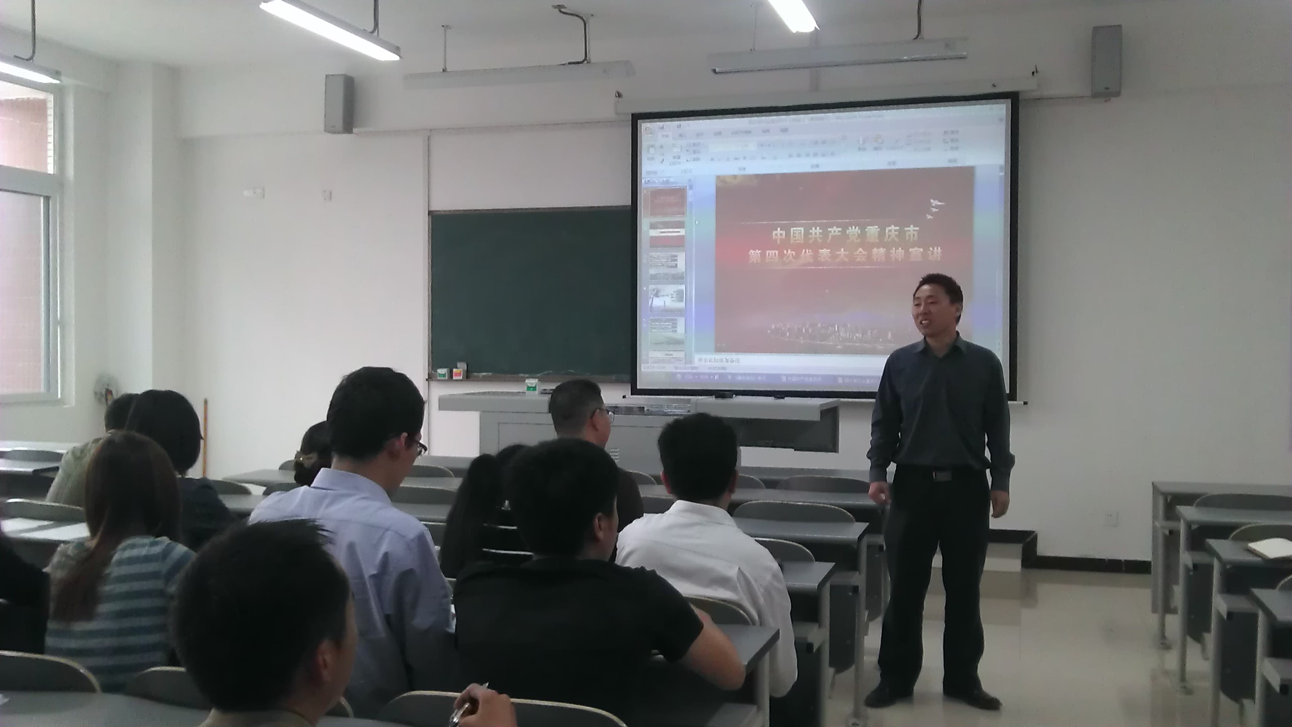 会上,支部书记唐春林详细地从大会背景、主题、直辖十五年的启示及党的先进性与纯洁性等四个方面详细地介绍了重庆市第四次党代会内容。他说,重庆市第四次党代会是高举中国特色社会主义伟大旗帜,以邓小平理论和“三个代表”重要思想为指导,深入贯彻落实科学发展观,实事求是总结了过去五年的工作和直辖十五年的巨大成就,深刻分析了重庆所处的发展阶段和面临的发展形势,科学制定了今后五年的总体任务和奋斗目标,全面部署了经济社会发展和党的建设的重点任务。他希望全体党员认真领会党代会精神,认清形势,坚决拥护党的领导,以饱满的热情积极投身于学校的建设,用实际行动践行党代会精神。