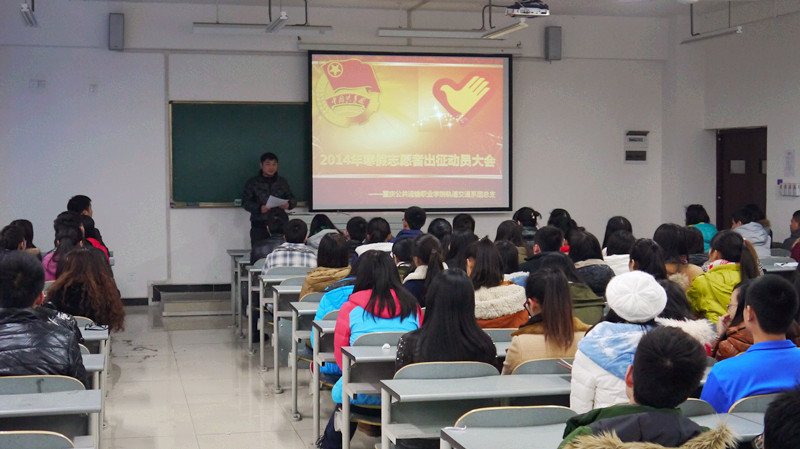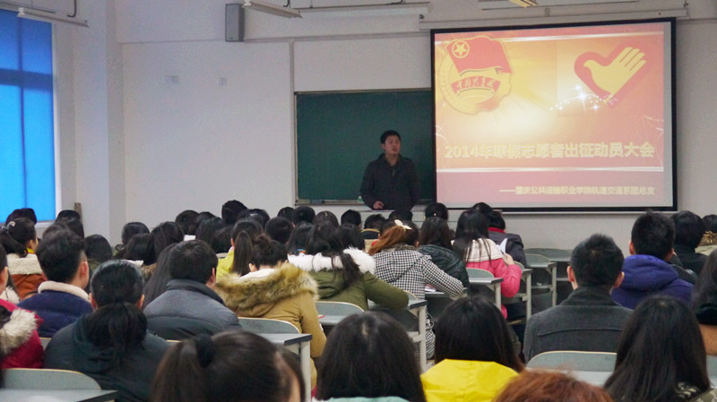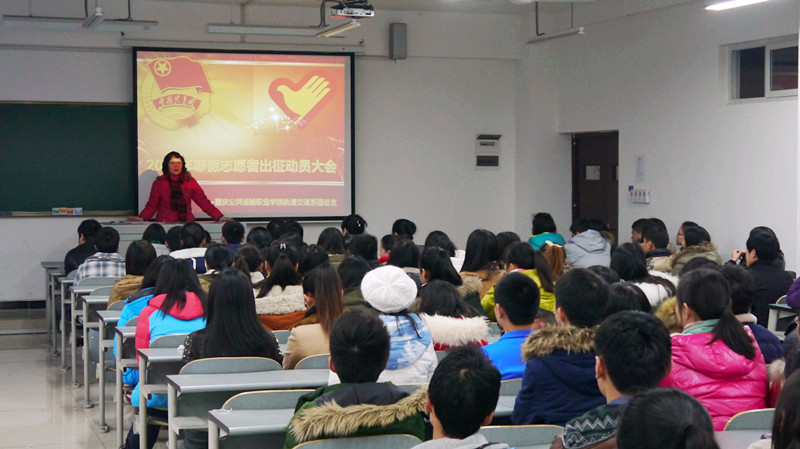 2014年1月10下午,轨道交通系在B101教室召开了2014年寒假轨道交通志愿者活动动员大会暨出征仪式。学院团委书记彭文华,轨道交通系主任助理丁晓莹,以及参加本次志愿者活动的带队教师和学生共计120余人出席了本次动员大会。