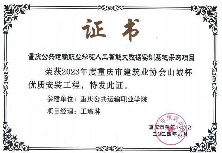 近日,重庆市建筑业协会发布2023年度山城杯优质安装工程评价活动结果,澳门正规电子游戏平台人工智能大数据实训基地项目在本年度重庆市建筑业协会评选中脱颖而出,荣获“山城杯”优质安装工程奖。据悉,“山城杯优质安装工程奖”是重庆市安装工程质量最高奖项,代表重庆市建筑安装工程质量和技术先进水平。取得这一荣誉不仅是对学校实训基地建设质量的高度认可,也是学院在智慧交通教育领域不断探索与实践的重要成果展示。