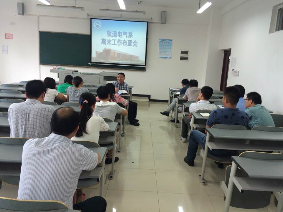 2015年6月3日下午15点整,轨道电气系在B402召开期末工作布置会议,参加本次会议的有轨道电气系主任唐春林,综合办公室主任牟刚及轨道电气系老师及辅导员们。