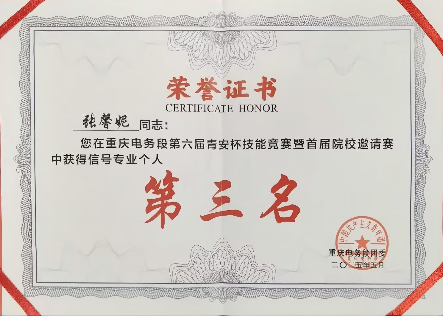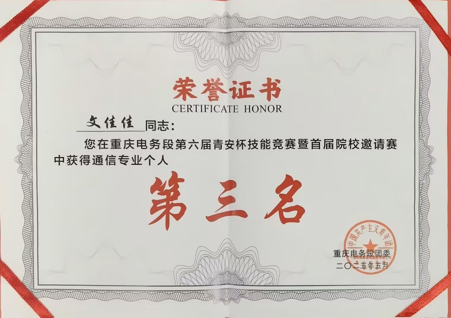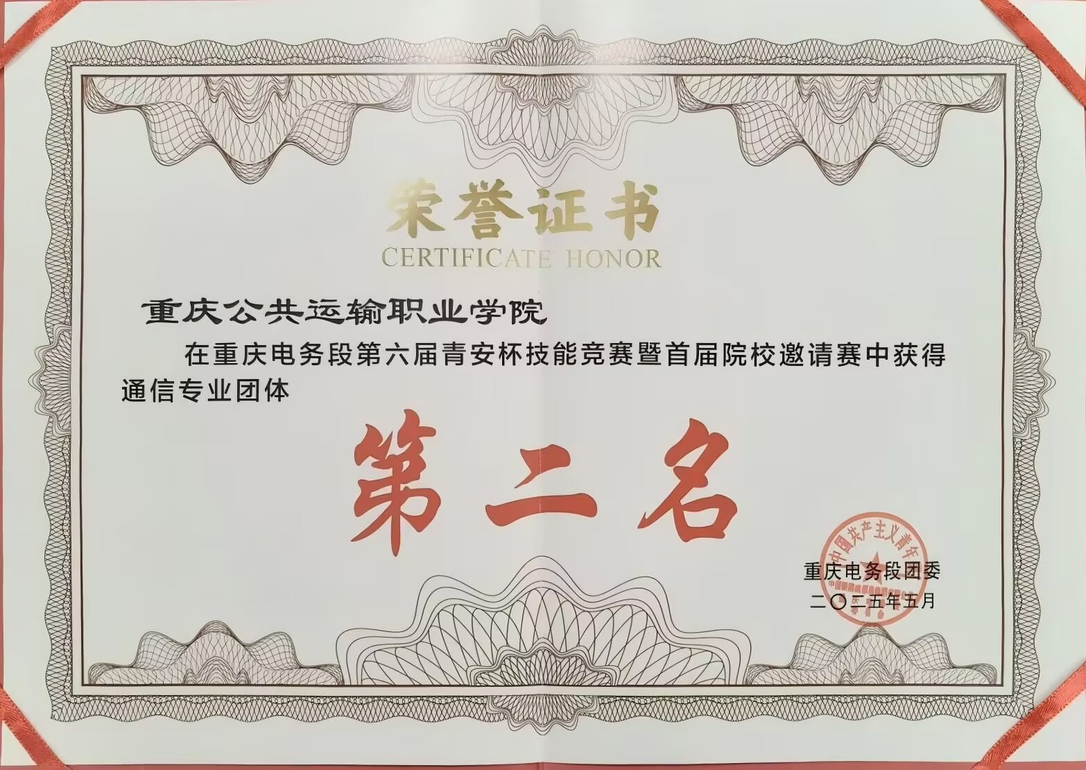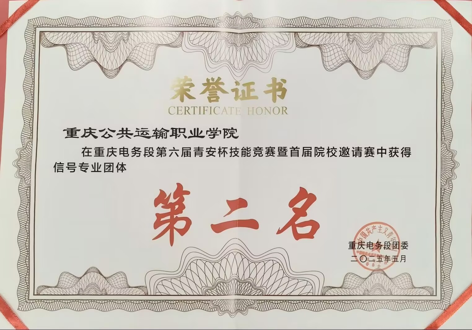 智慧交通学院 学院动态 专业介绍 师资队伍 党建动态 学工动态 就业指南 教学科研 学院动态首页 > 智慧交通学院 > 学院动态 > 我院学生在重庆电务段第六届“青安杯”技能竞赛中斩获5个奖项 来源:学院动态发布时间:2025-06-19 18:02访问量: 我院学生在中国铁路成都局集团重庆电务段举办的第六届“青安杯”技能竞赛暨首届院校邀请赛中,表现优异,斩获个人奖3项,团体奖2项。 据了解,本次比赛设置信号、通信两大专业赛道,采用“理论+实作”双维度考核模式,着重检验选手应对轨道电路故障处理、光缆接续等铁路一线技术难题的实战能力。
