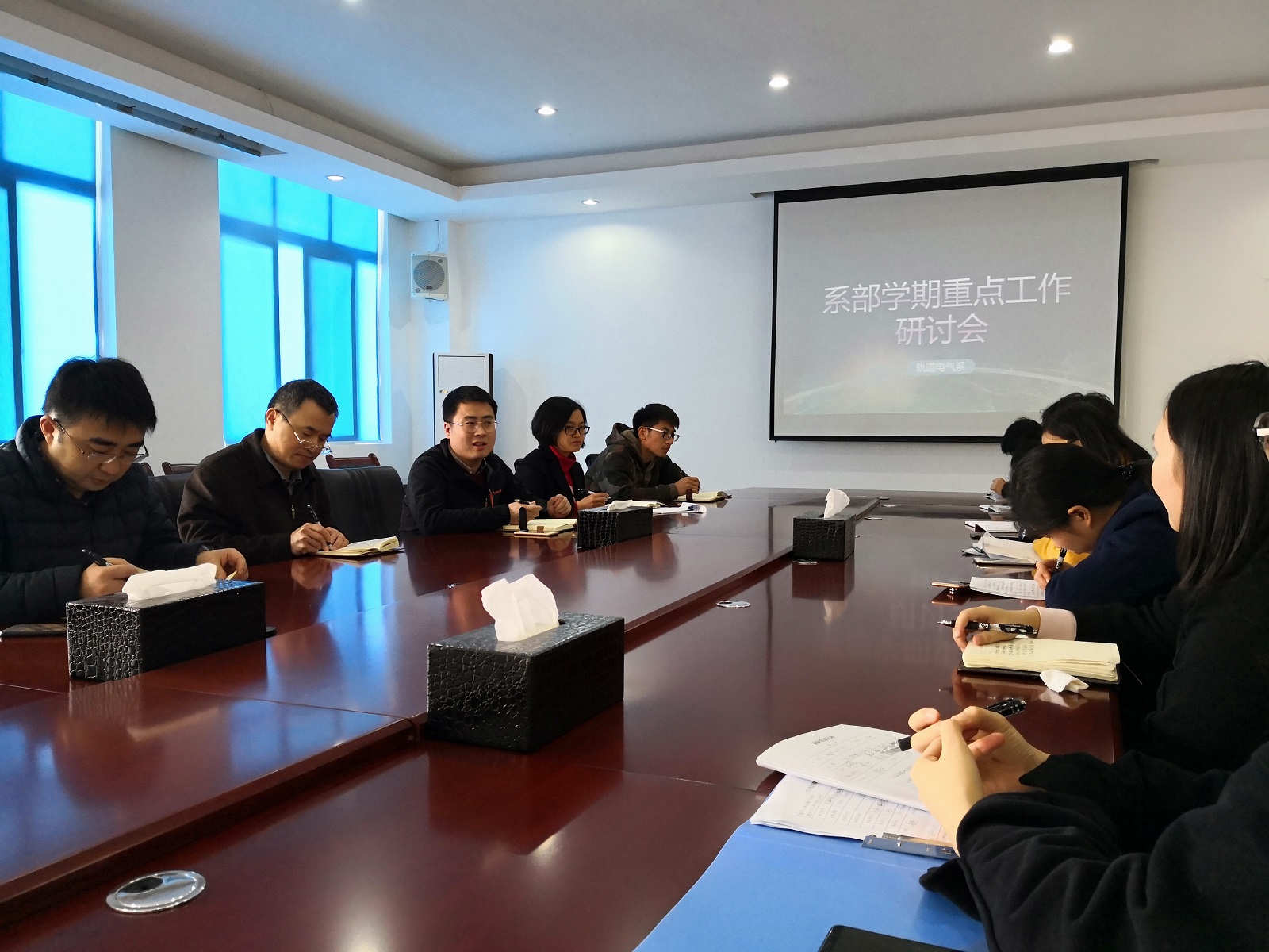 2018年3月14日13:00,轨道电气系在A401会议室召开本学期重点工作研讨会,轨道电气系主任何友全、副主任陈兴劼(主持工作)、综合办公室主任牟刚、系部各教科研团队负责人、学工办负责人以及系部行政工作人员参与了本次会议。会议由陈兴劼主任主持。本次会议主要就本学期系部整体重点工作进行了梳理与讨论。