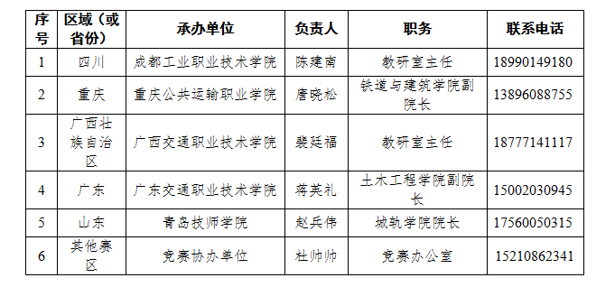 为确保“智联友道杯”城市轨道交通线路工赛项顺利举办,由各区域(或省)承办单位承担预赛具体组织工作,全国竞赛组委会提供相应的协助工作。各赛项承办单位名单详见附件(如有增加会随时通知)。
