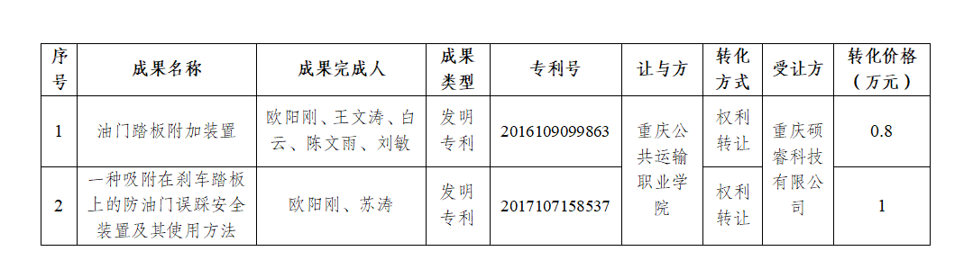 当前位置:首页 > 新闻中心 > 通知公告 > 通知公告 科技成果转化公示(2024年度第二批) 来源:通知公告发布时间:2024-04-15 08:14访问量: 根据学校《科技成果转化管理办法(试行)》(渝运输职院〔2022〕552号)规定,现将2024年度第二批“油门踏板附加装置”、“一种吸附在刹车踏板上的防油门误踩安全装置及其使用方法”2件发明专利成果转让事项公示如下: 公示期:2024年4月15日至2024年4月29日 在公示期间如对以上专利成果转让有异议,请以书面材料形式实名向科研处反映。 澳门正规电子游戏平台 2024年4月15日 (联系人:权晓雪;电话:19122745853)
