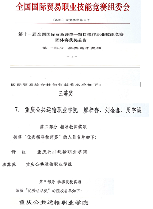 为贯彻落实中共中央、国务院《关于推进贸易高质量发展的指导意见》,加快培育进出口贸易竞争优势,推进经济高质量发展,培育新时代国际贸易及关务专业人才队伍,在11月13日结束的由中国对外贸易经济合作企业协会主办的“第十一届全国国际贸易暨单一窗口操作职业技能竞赛”团体赛中,运输贸易学院(数字贸易产业学院)派出的报关与国际货运专业2001班廖梓存、刘金鑫、周宇城三位同学代表学校参赛喜获国际贸易综合技能全国三等奖。本次比赛采用线上方式,主要考核出口成本核算、出口合同执行、信用证申请与更改、关务事务处理等核心技能能力,比赛为全英文,全国27支本科高职院校代表队参加了本次比赛。同时,学校获“优秀组织奖”,舒红、唐苏苏老师获优秀指导教师。