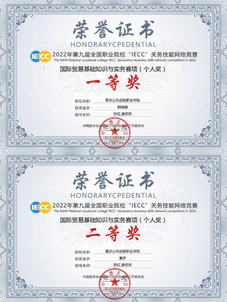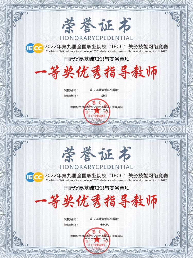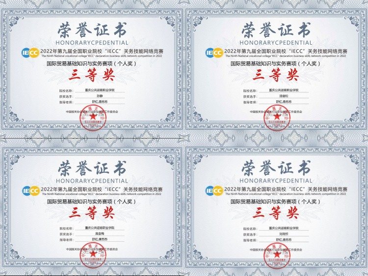 运输贸易学院 交通运营管理 财税大数据应用专业 关务与外贸服务 市场开发与营销 城市轨道交通运营管理 铁道运营管理 跨境电子商务 铁路物流管理 关务与外贸服务首页 > 运输贸易学院 > 专业设置 > 关务与外贸服务 > 运输贸易学院喜获第九届“IECC”全国职业院校关务技能网络大赛一等奖 来源:关务与外贸服务发布时间:2023-03-23 11:29访问量: 第九届“IECC”全国职业院校关务技能网络大赛获奖名单正式公布,我院榜上有名。学生个人赛项中,我院关务与外贸服务、跨境电子商务专业表现突出,分获“国际贸易基础与实务”赛道一等奖1名,二等奖1名,三等奖4名;指导教师舒红、唐苏苏被评为“优秀指导教师”。 本次赛事由中国报关协会报关行业职业教育工作委员会组织,全国12个省、市、自治区的75所院校的学生参加。
