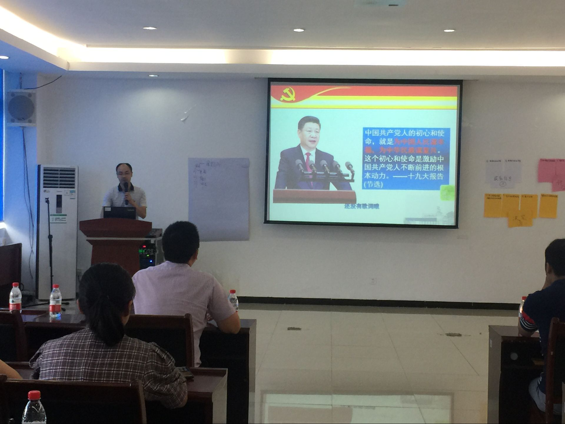 首先进行第一项议程,由运输贸易系党支部副书记曾庆东为党员及入党积极分子讲党课《不忘初心 牢记使命 永久奋斗》,重点讲解习近平总书记在北大师生座谈会上的讲话精神;运输贸易系党支部书记赵柱文同志讲党课《十九大报告讲解》。