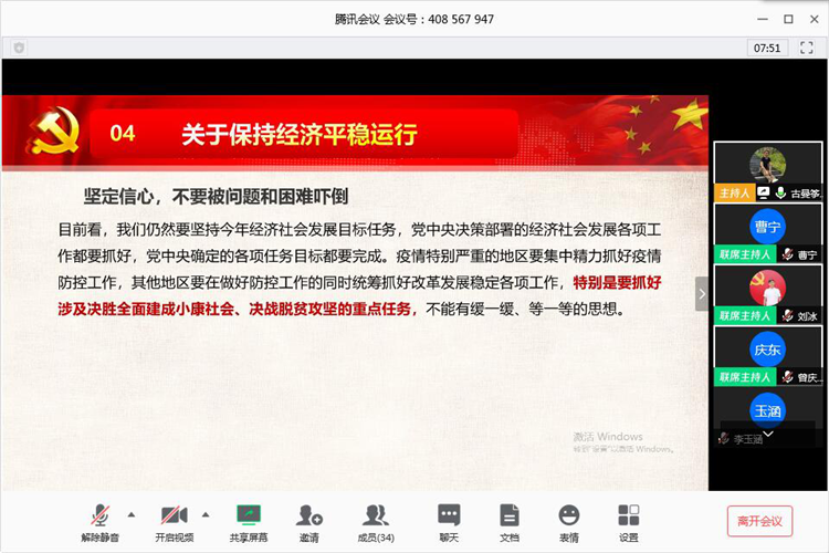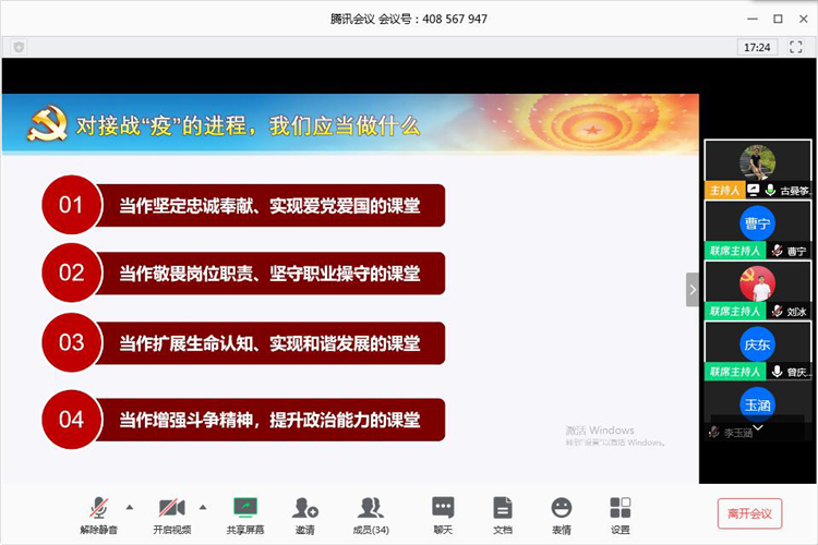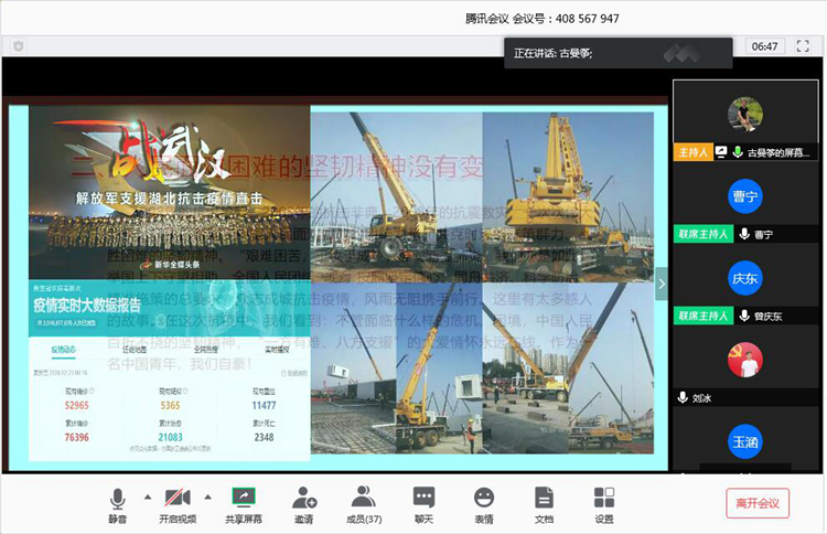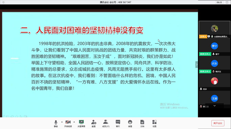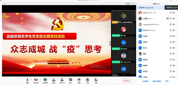 2020年3月27日19:30,运输贸易系学生党支部通过腾讯会议线上开展主题党日活动,本次活动主题为:众志成城,战“疫”思考,运输贸易系党总支副书记曾庆东,党支书记古曼筝,学生党支部全体教师党员和学生党员参加本次会议。
