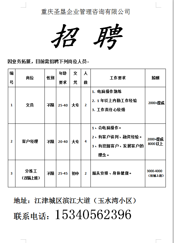 运输贸易学院 招聘通知 就业动态 毕业生风采 校企合作 政策咨询 创业风采 招聘通知首页 > 运输贸易学院 > 就业创业 > 招聘通知 > 重庆圣恳企业管理咨询有限公司 来源:招聘通知发布时间:2019-03-22 20:38访问量: