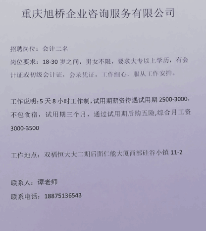 运输贸易学院 招聘通知 就业动态 毕业生风采 校企合作 政策咨询 创业风采 招聘通知首页 > 运输贸易学院 > 就业创业 > 招聘通知 > 重庆旭桥企业咨询服务有限公司急招会计2名! 来源:招聘通知发布时间:2019-03-22 20:45访问量:
