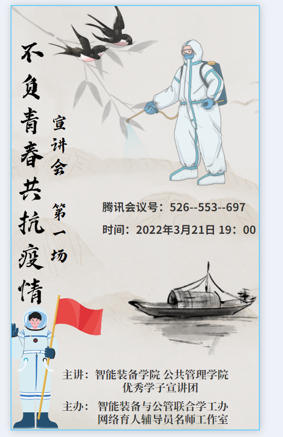 3.智能装备与公管联合学工办、网络育人辅导员名师工作室组织两个学院优秀学子宣讲团,开展“不负青春 共抗疫情”宣讲直播会。疫情期间,充分发挥学生党员、学生干部的示范引领作用。