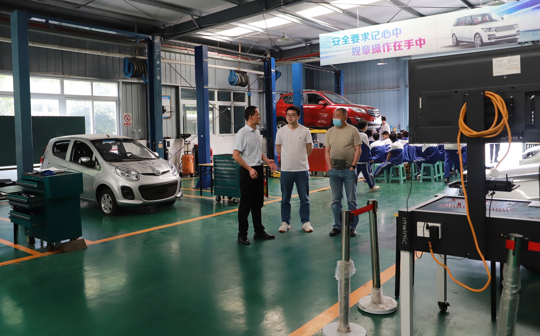 会后,张仲文、唐跃辉一行参观了学校汽车实训室。