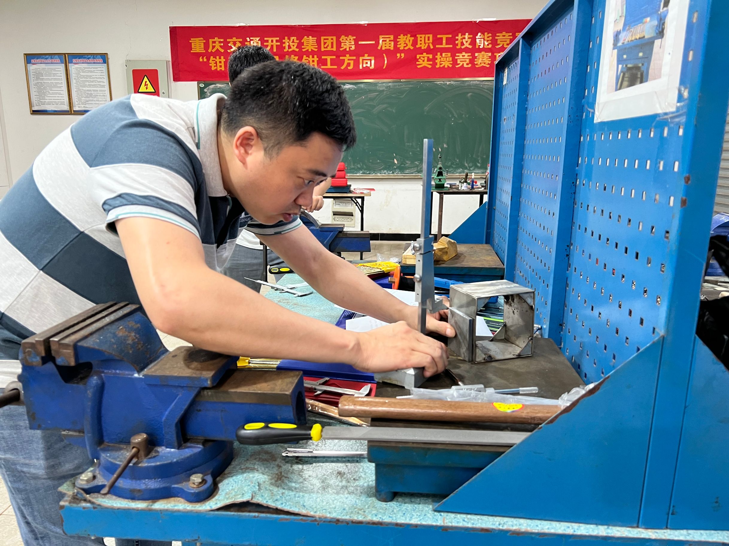 重庆交通开投集团第一届教职工技能大赛钳工赛项(机修钳工方向),5月11日下午在学校主校区金工实训室举行,经过比拼,比赛一等奖由智能装备学院向军老师夺得,另有5名教师分获比赛二、三等奖。