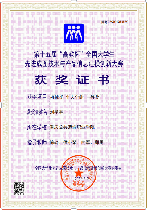 智能装备学院 学院新闻 学生活动 学院新闻首页 > 智能装备学院 > 学院动态 > 学院新闻 > 喜讯!学院学生荣获先进成图技术与产品信息建模创新全国大赛三等奖 来源:学院新闻发布时间:2022-10-21 11:12访问量: 7月29日至8月2日,学院专任教师陈玲指导机械制造Z2102学生刘星宇参加第十五届全国大学生先进成图技术与产品信息建模创新大赛决赛,获得个人全能三等奖。